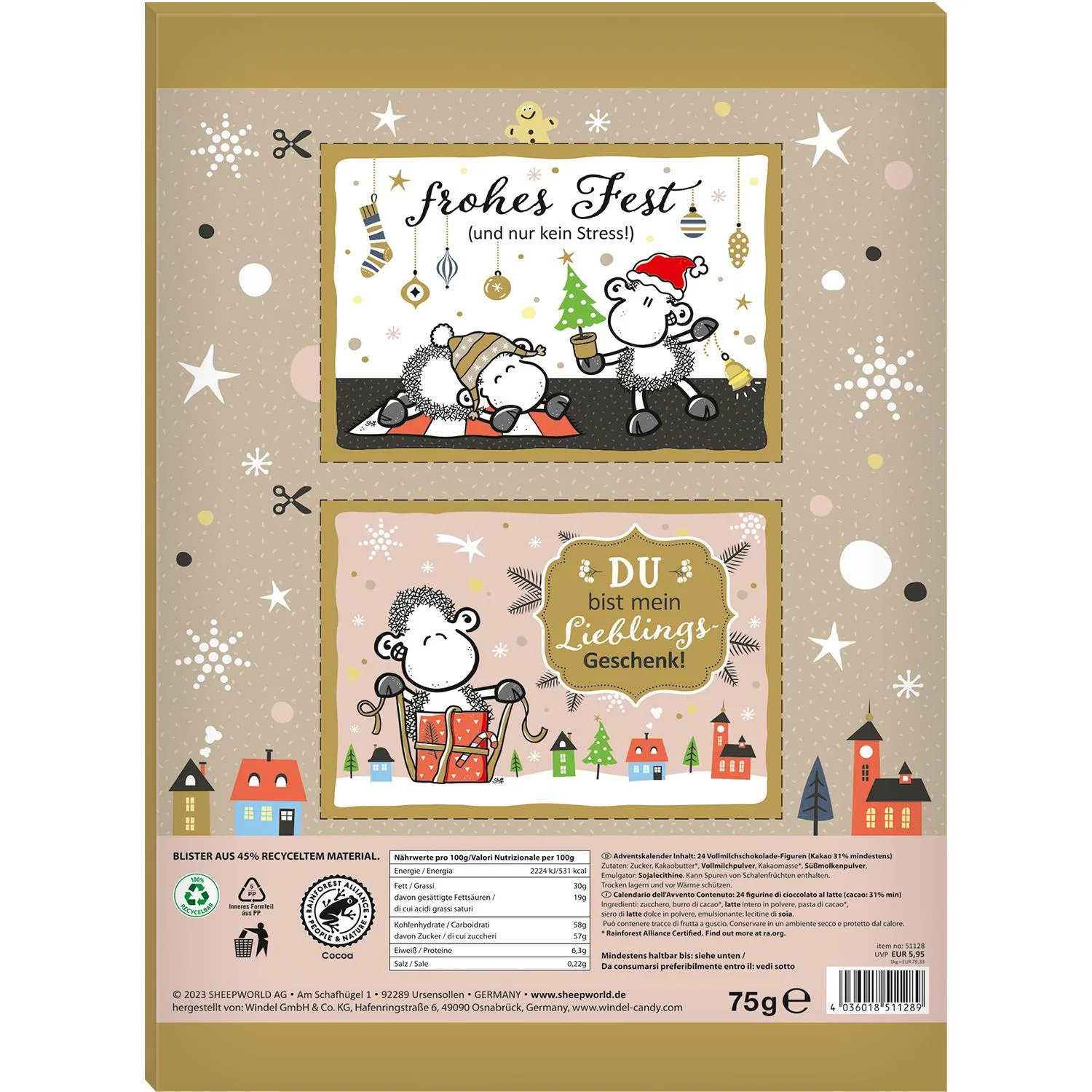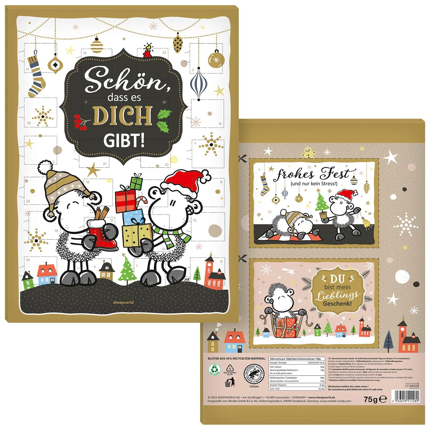 - mit 14 weihnachtlichen Vollmilchschokolade-Figuren und 10 sheepworld Vollmilch-Schäfchen