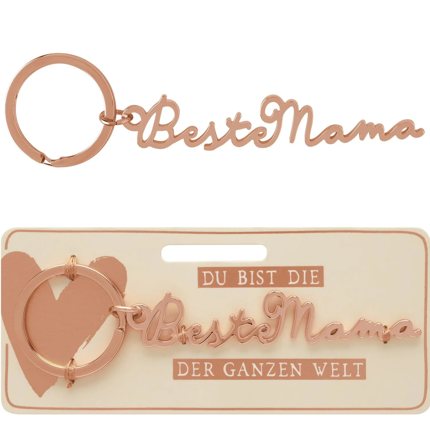 Dieser Schlüsselanhänger in glänzendem Roségold ist eine super süße Aufmerksamkeit zum Muttertag oder einfach mal so zwischendurch! Die Botschaft »Du bist die Beste Mama der ganzen Welt« ist unmissverständlich und wird sicher das Herz Deiner Mutter berühren!