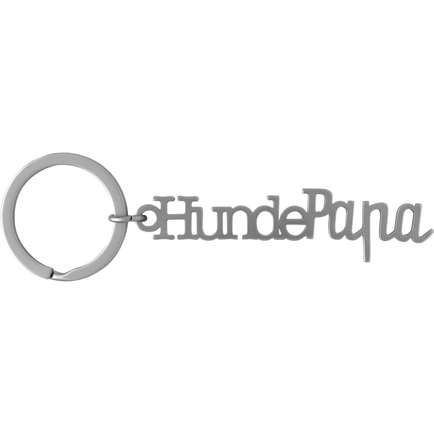 Eine liebevolle Aufmerskamkeit für Hundebesitzer: ein silberner Metallschriftzug mit der Botschaft »Hundepapa - Der mit dem Hund geht«. Dieser außergewöhnliche Anhänger wird den Vierbeiner und seinen Besitzer auf langen Spaziergängen immer begleiten!