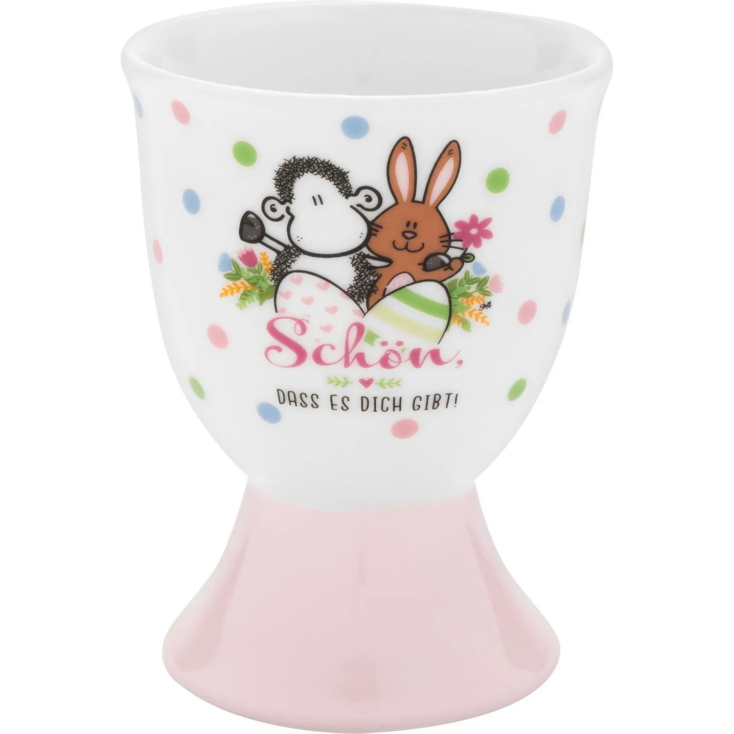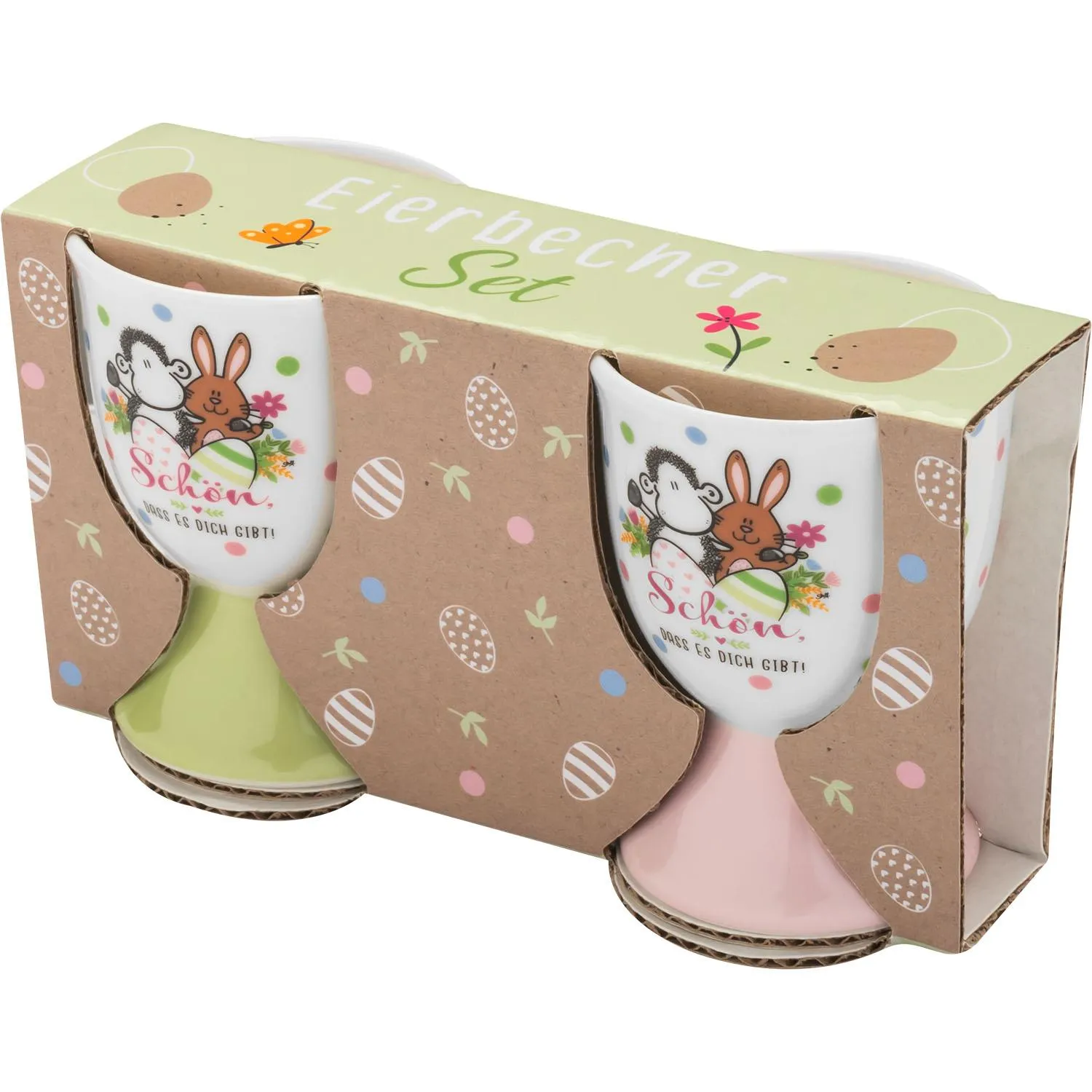 Mit diesem bezaubernden Eierbecher-Set wird jedes Frühstück zu einem kleinen Osterhighlight! Der liebevolle Spruch „Schön, dass es Dich gibt!“ zusammen mit dem süßen Motiv eines kleinen Häschens und Schäfchens zaubert sofort ein Lächeln auf jedes Gesicht. Die beiden niedlichen Freunde bringen nicht nur fröhliche Osterstimmung, sondern erinnern dich jeden Morgen daran, wie besonders du bist. Perfekt für ein gemütliches Frühstück und als Geschenk, das von Herzen kommt – für jemanden, der dir wichtig ist und dem du eine Freude bereiten möchtest.