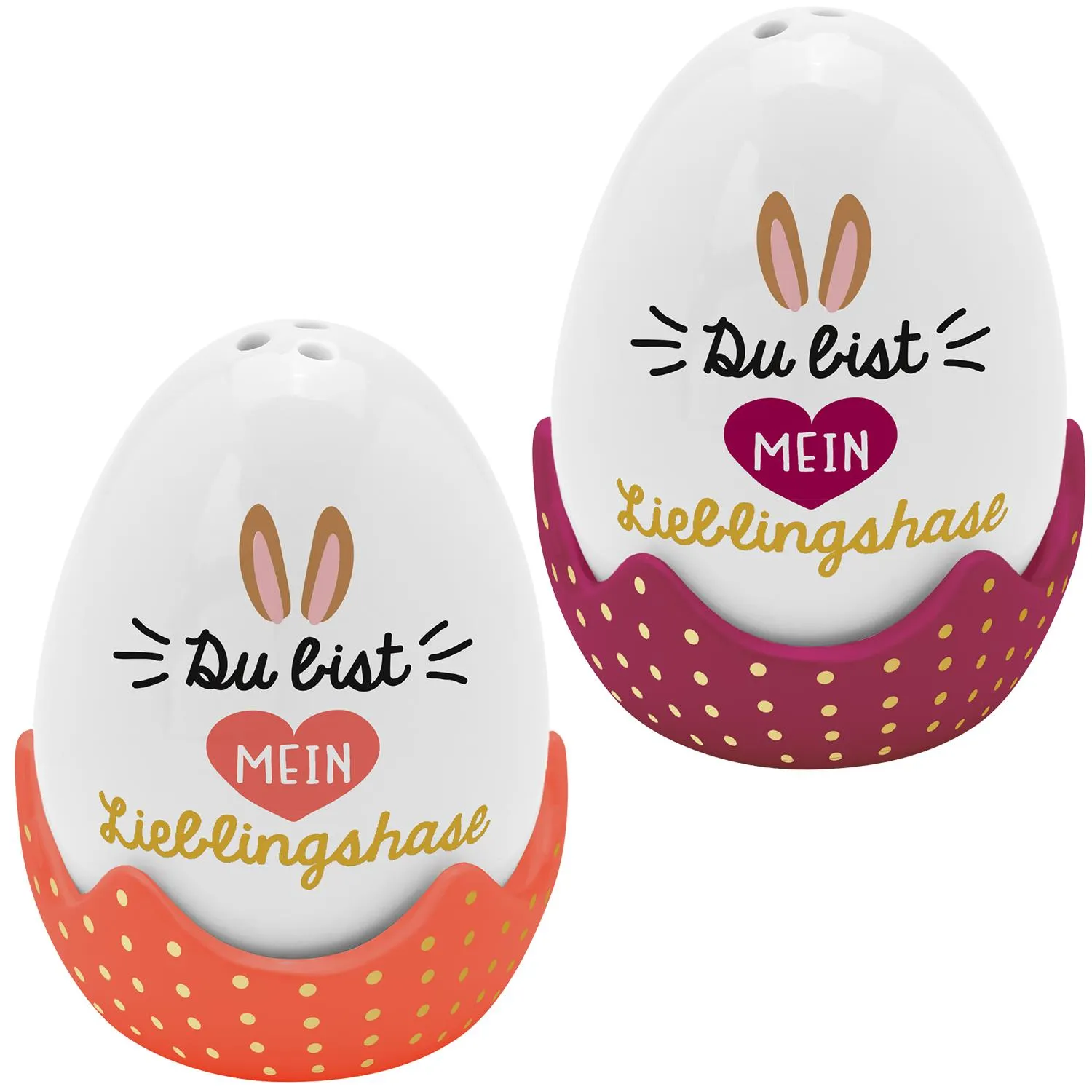 Wer ist Dein Lieblingshase? Mache Deinem Schatz eine Freude, die von Herzen kommt und schenke ihm dieses super niedliche Eierbecher-Set das zeitgleich ein Salz- und Pfefferstreuer ist. Mit dem herzlichen Spruch wirst Du sicherlich für Herzklopfen bei Deinem Schatz sorgen.