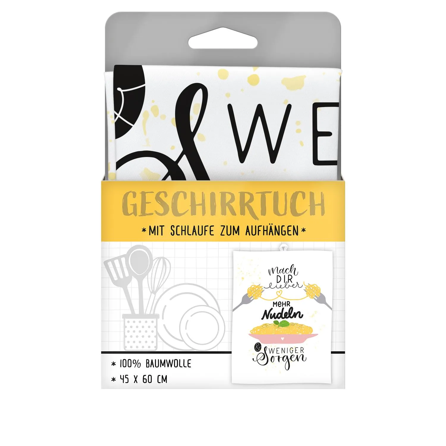 Perfekt für jeden, der sich manchmal zuviel Gedanken über alles macht! »Mach Dir mehr Nudeln & weniger Sorgen« ist die Botschaft auf dem Geschirrtuch und sorgt in Deiner Küche für eine entspannte Atmosphäre und lässt Dich alle Deine Alltagssorgen vergessen.