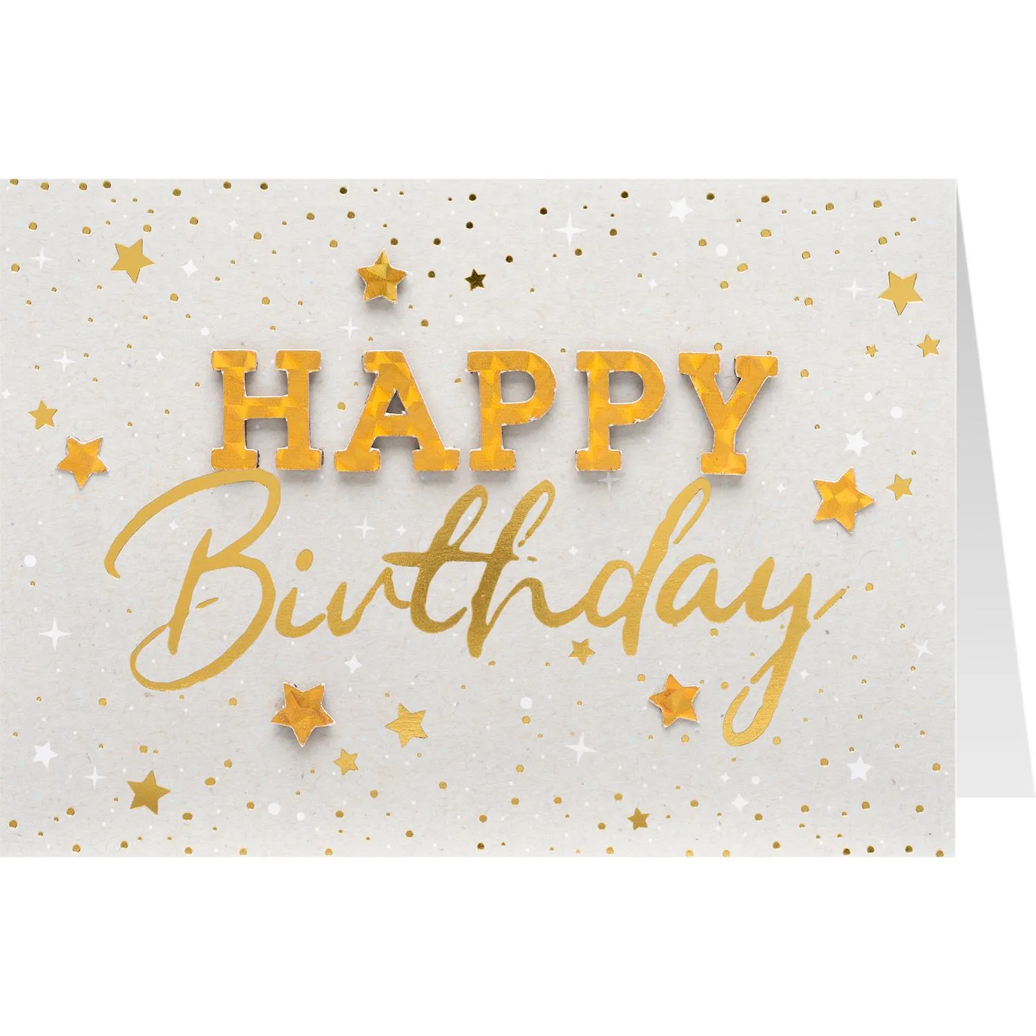 Glänzende Goldfolie und kunstvolles Sternen-Design machen diese Klappkarte in Querformat zur perfekten Geburtstagskarte für die beste Freundin, den Bruder oder Deinen Lieblingskollegen! Schreibe einen persönlichen Gruß in die Karte und mache sie zu einem traumhaften Herzensbotschafter!