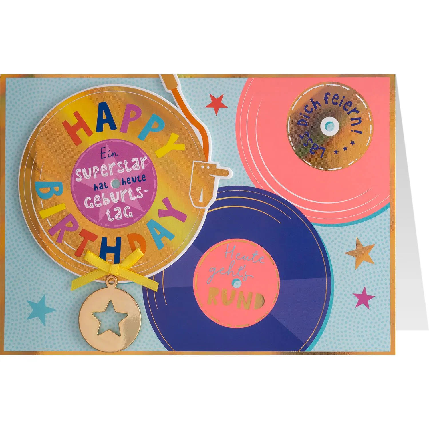 Happy Birthday Superstar! Die perfekte Grußkarte um allen Musikfans zum Geburtstag zu gratulieren! Das hippe Plattenspieler-Motiv und der glänzende Sternchenanhänger machen die Karte zum echten Blickfang.