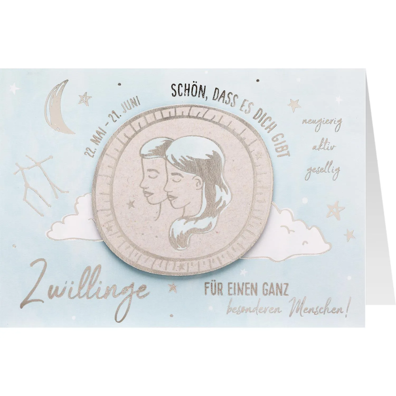 Traumhafte Glanzeffekte durch edle Silberfolierung und ein unverwechselbares Sternzeichen-Design machen diese Klappkarte zum echten Herzensbotschafter! Die handgemachte Grußkarte für Lieblingsmenschen mit Sternzeichen Zwilling ist garantiert der Hingucker auf der nächsten Geburtstagsparty.