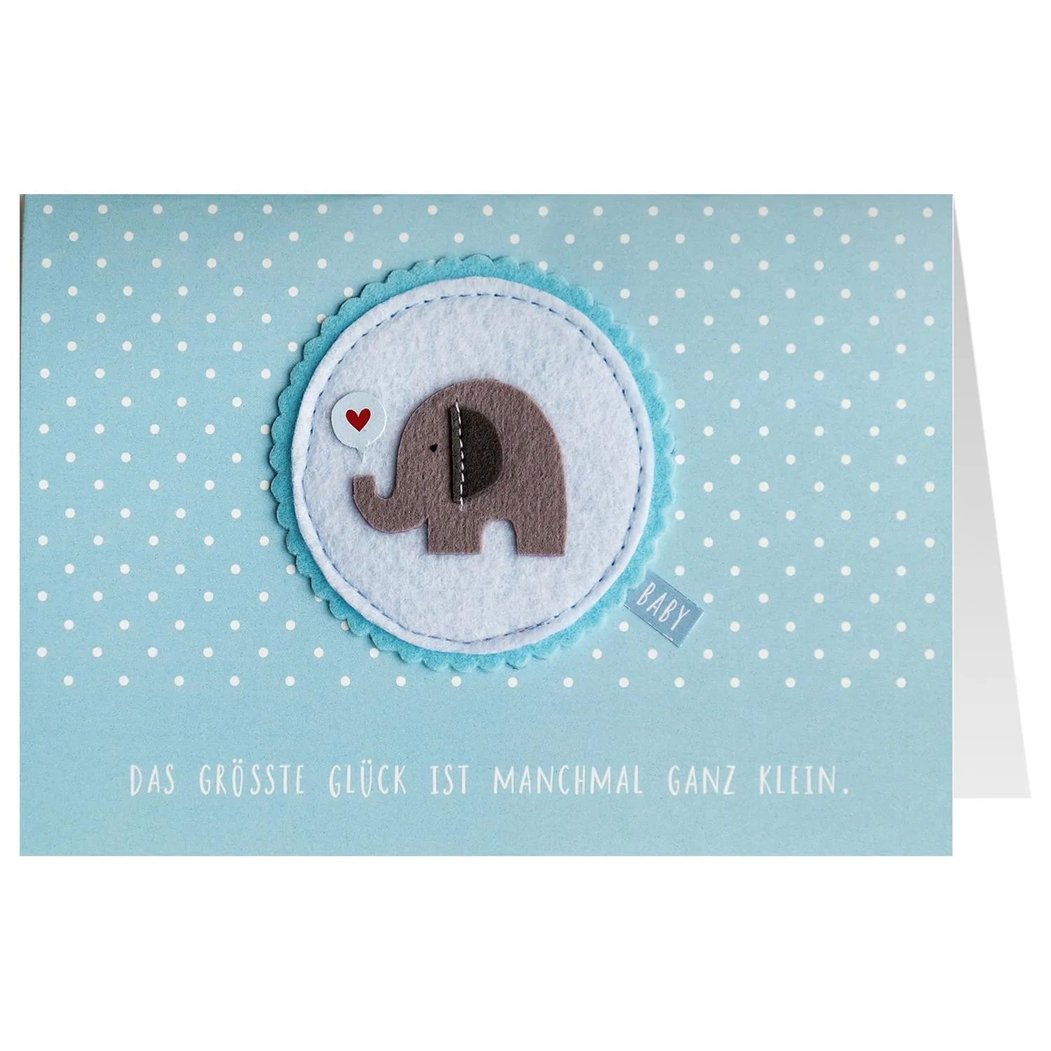 »Das größte Glück ist manchmal ganz klein.« Mit dieser niedlichen Filzkarte mit Elefanten-Motiv kannst Du perfekt liebe Glückwünsche zur Geburt verschenken.