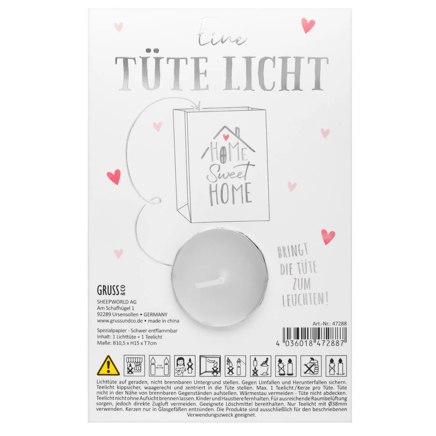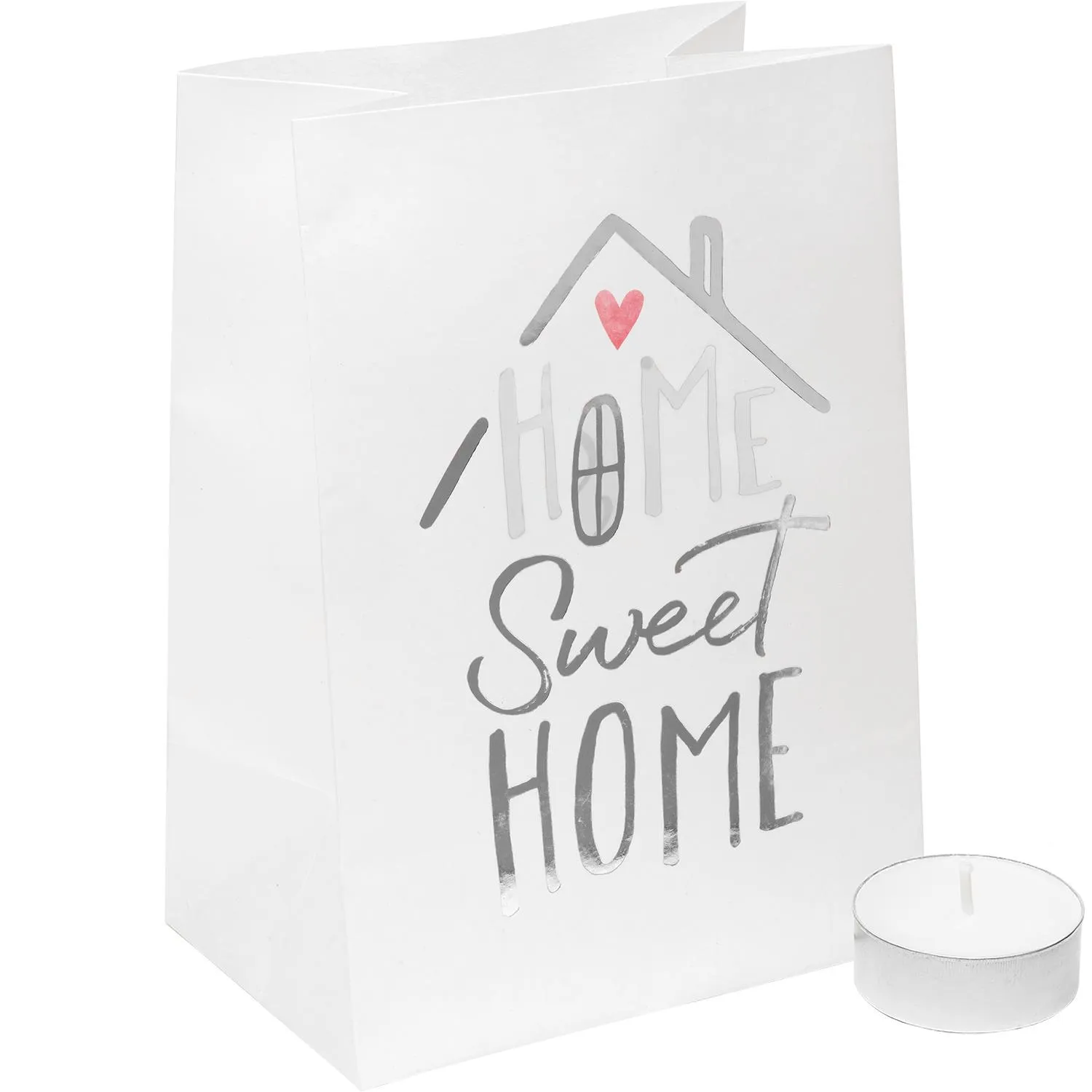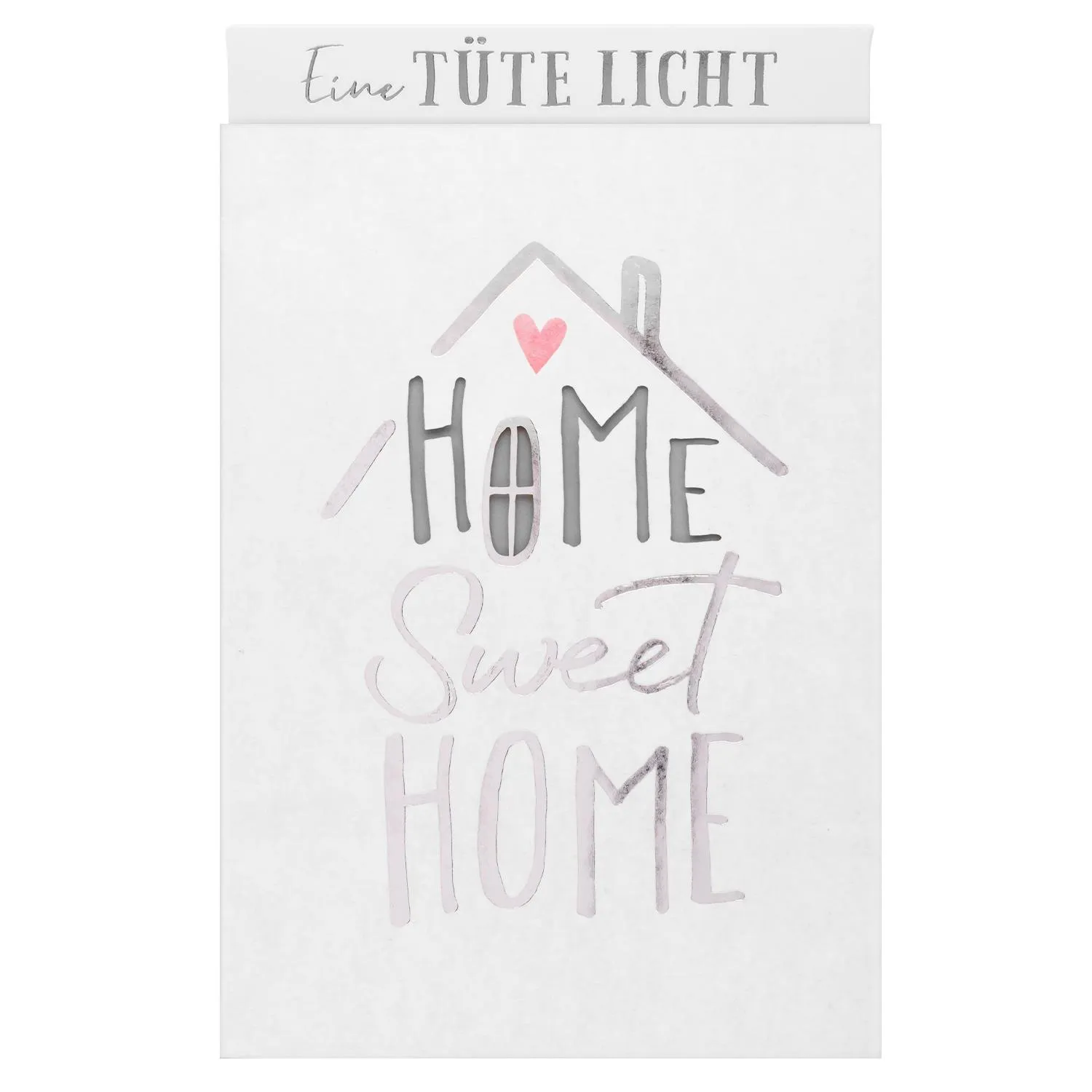 Eine aufmerksame Geschenkidee für den Umzug in die erste gemeinsame Wohnung! Die Lichttüte mit der Botschaft »Home Sweet Home« in glänzender Silberfolierung spendet wunderschönes Licht und weckt sofort ein Gefühl von Heimat & Fröhlichkeit bei den Beschenkten!