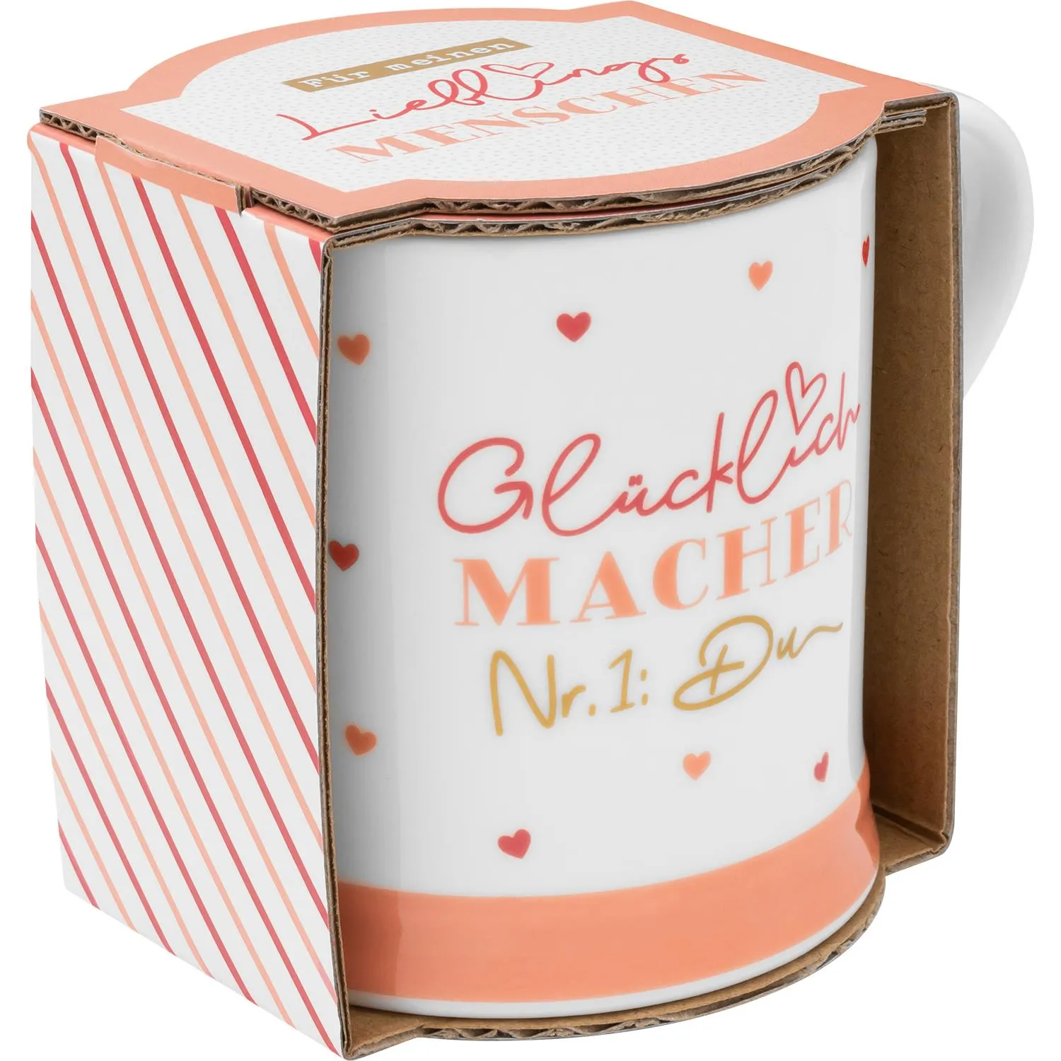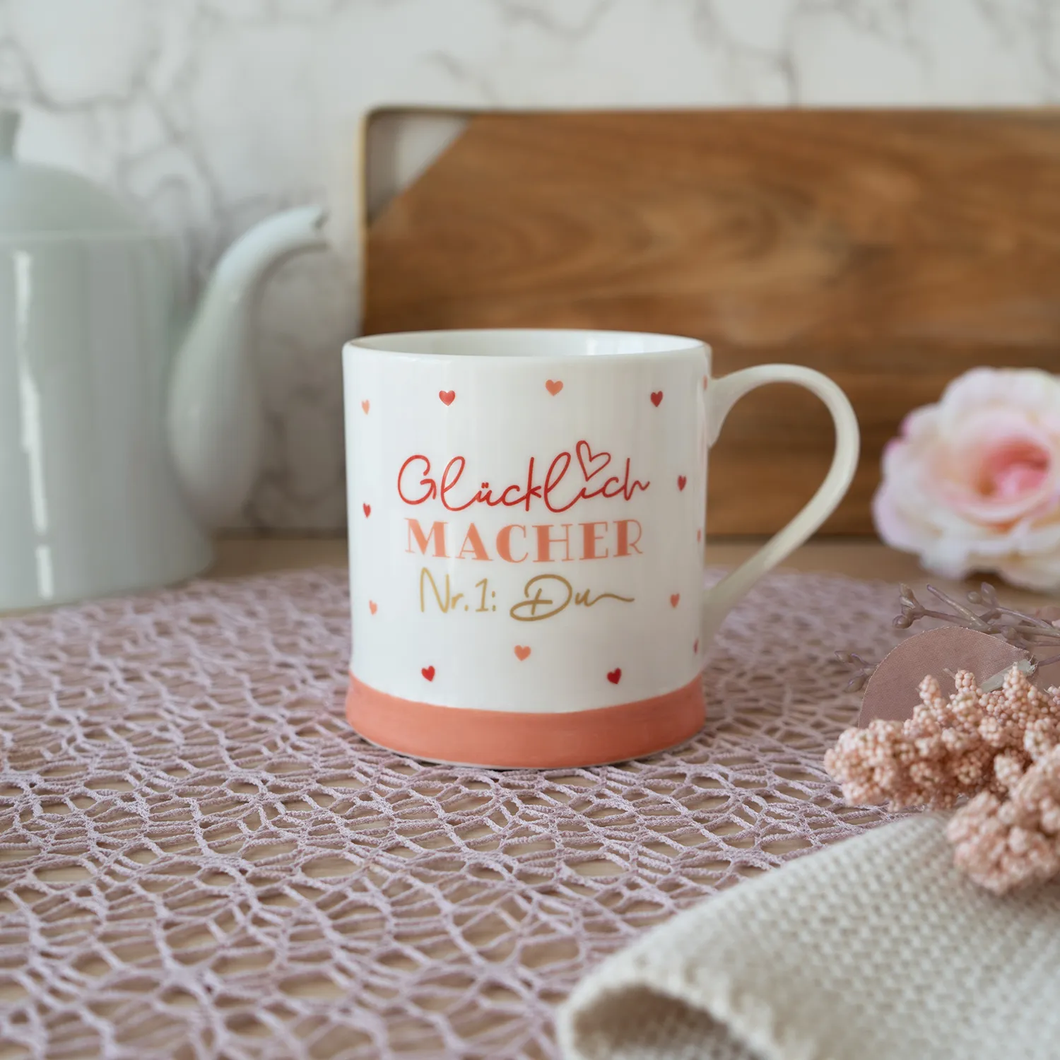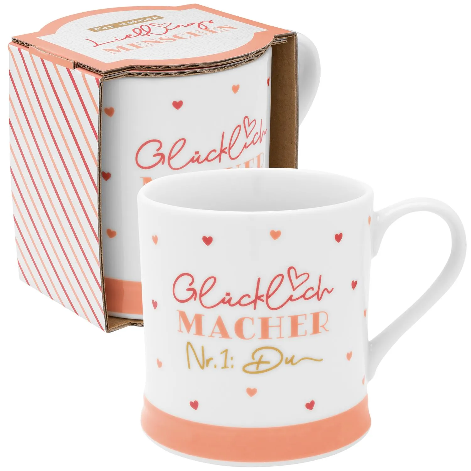 Jeder verdient einen Glücklichmacher! Unsere Tasse mit dem bezaubernden Spruch »Glücklichmacher Nr. 1: Du« ist wie eine tägliche Dosis positiver Energie für Dich oder Deine Liebsten. So schmeckt der morgendlichen Kaffee oder der warme Kakao am Abend gleich viel besser! Diese Tasse erinnert Deinen Lieblingsmenschen immer daran, wie wichtig er für Dich ist. So schenkst Du Deinem Herzensmenschen nicht nur eine stylische Tasse, sondern auch ein breites Lächeln.