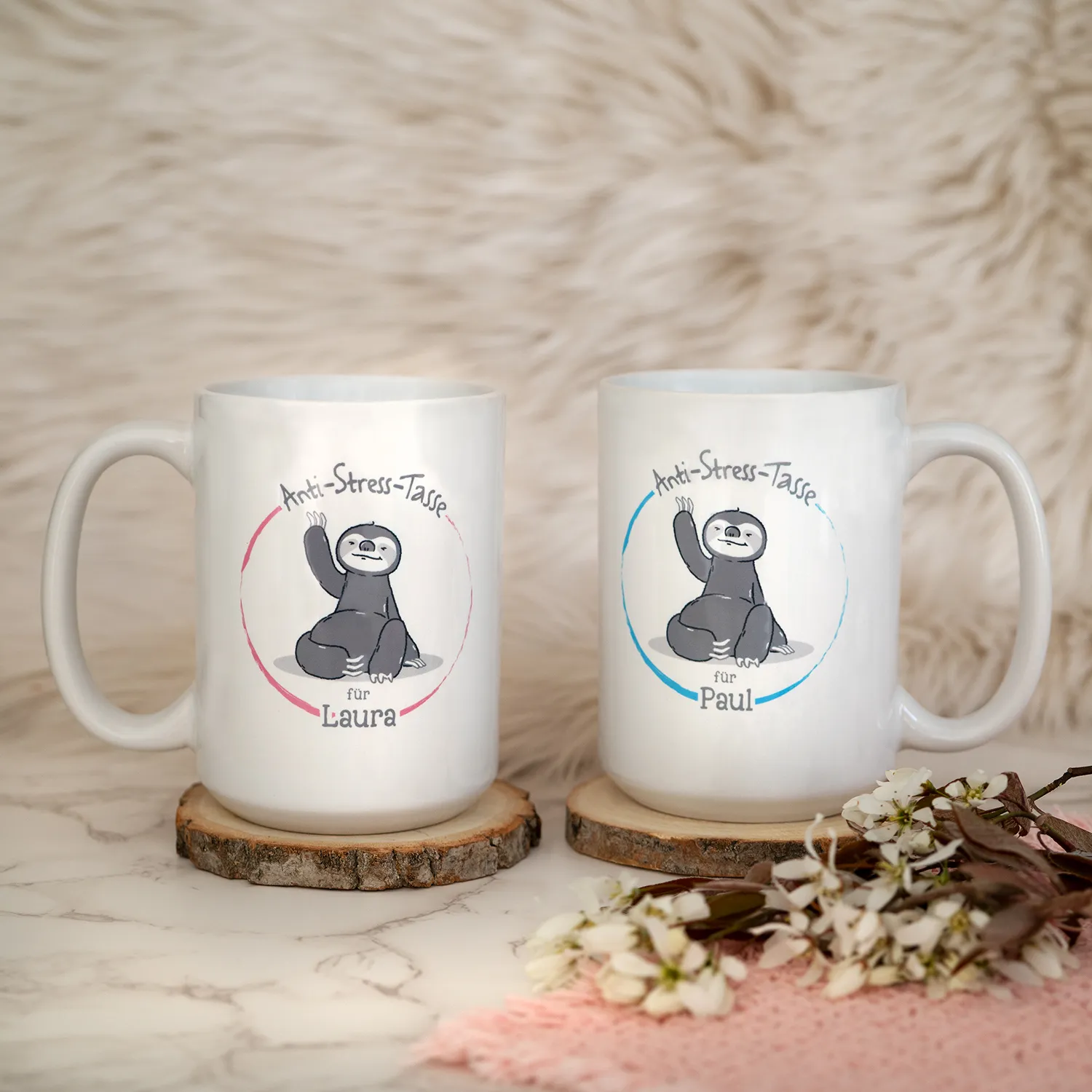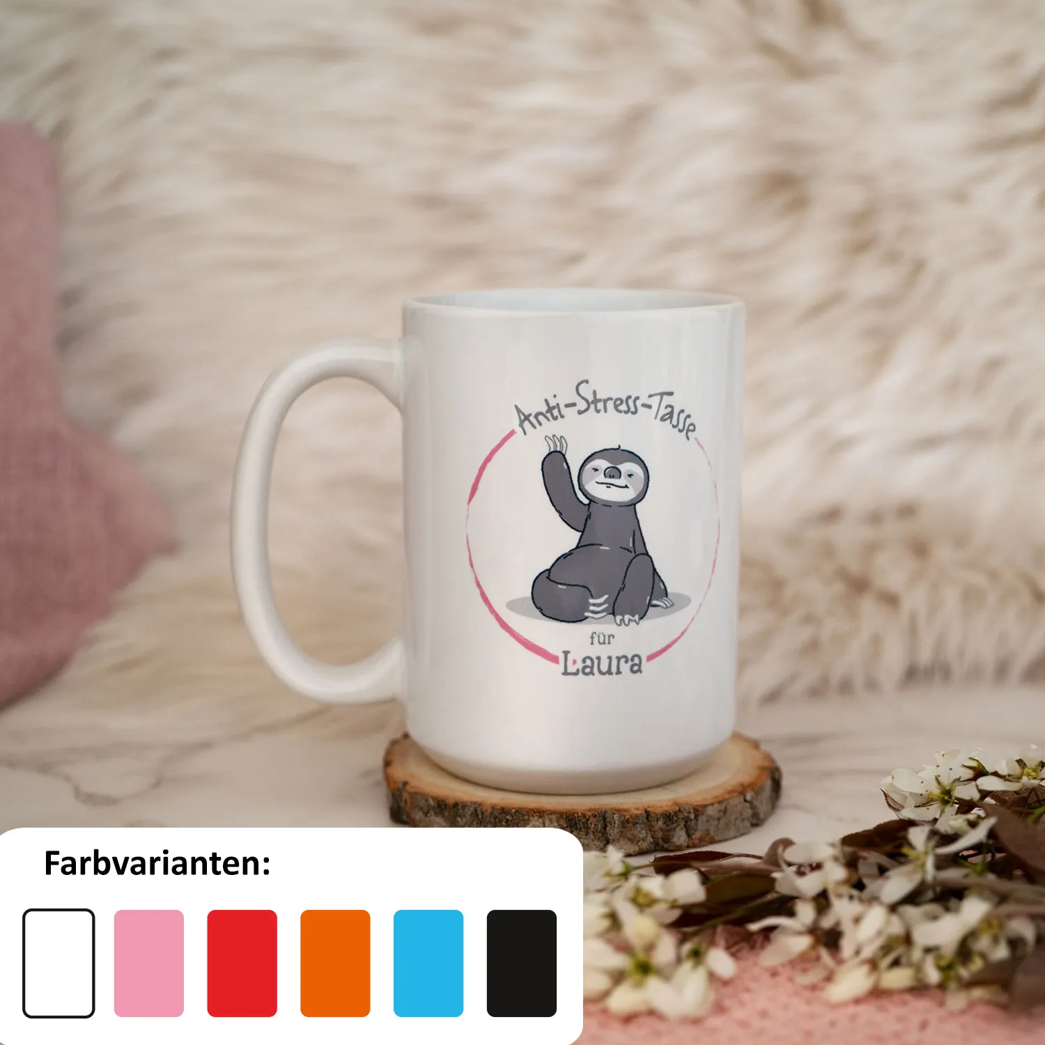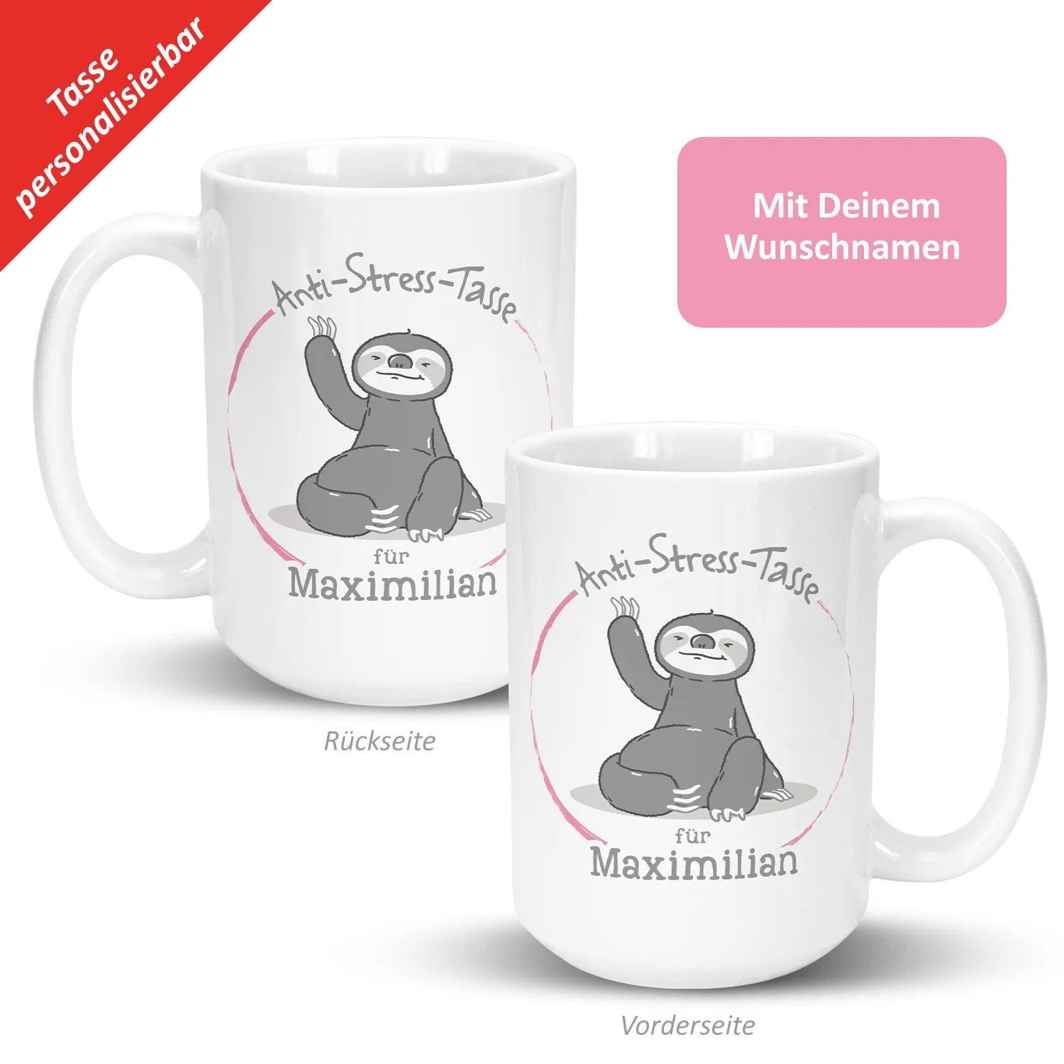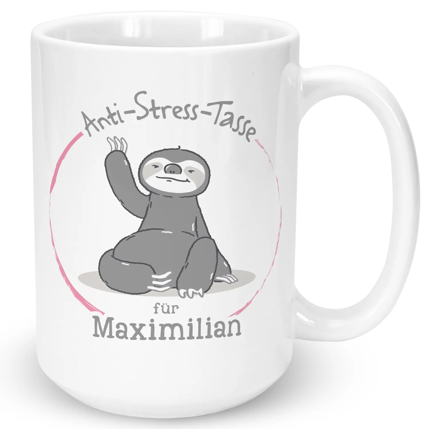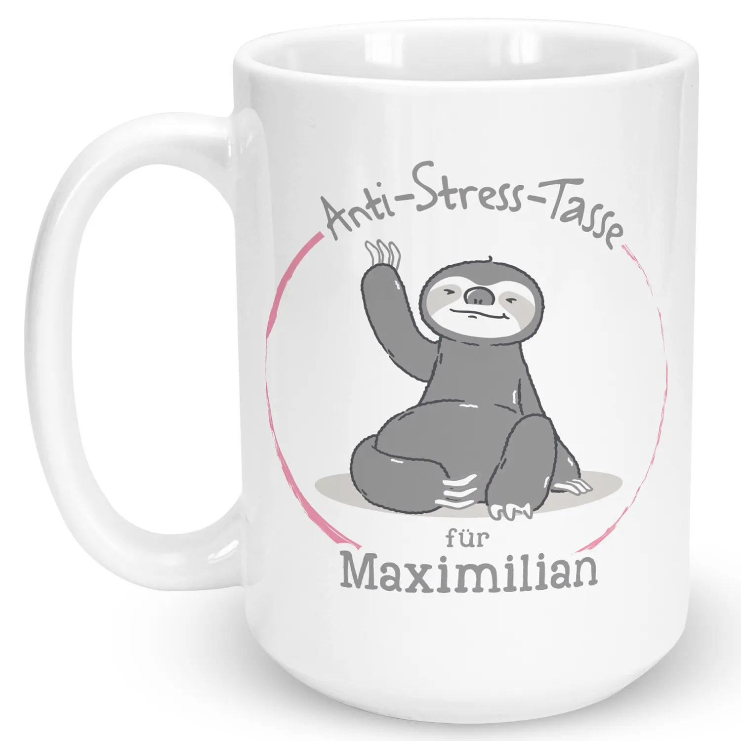 Ein hektischer Alltag, anspruchsvolle Arbeit und zusätzlich noch der Stress in der Freizeit - das Leben kann manchmal ziemlich herausfordernd sein. In solchen Momenten ist die Anti-Stress-Tasse mit dem entspannten Faultier genau das Richtige. Einfach eine Pause bei einer Tasse Kaffee oder Tee mit diesem individuellen Becher einlegen und schon kann man neue Energie tanken. Auf diese Weise nicht nur frische Kraft schöpfen, sondern auch mit dem farbenfrohen Innendruck und dem roten Farbtupfer etwas Farbe in den Alltag bringen. Einfach den Wunschnamen eines gestressten Zeitgenossen eingeben und das perfekte Entspannungsgeschenk erhalten.