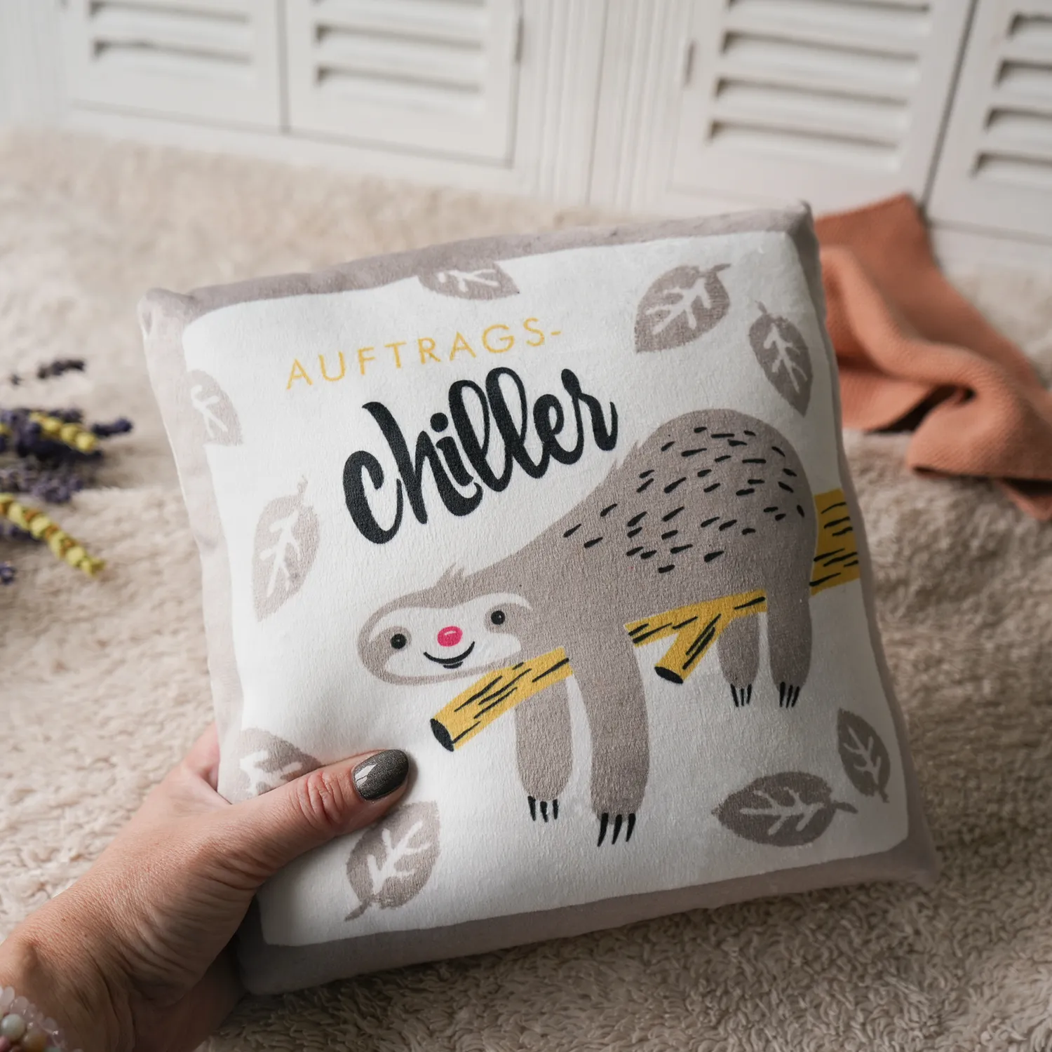 Du bist ein Meister im Entspannen und möchtest Deine Chill-Fähigkeiten auf ein neues Level bringen? Dann ist das Plüschkissen ""Auftragschiller"" mit seinem niedlichen Faultier Motiv genau das Richtige für Dich! Schmiege Dich an das flauschige Plüschkissen, spüre die Gemütlichkeit und lass Dich von seinem entspannten Faultier-Motiv inspirieren."