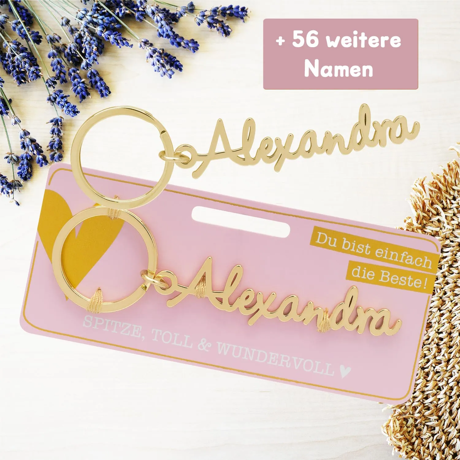 - Metallschriftzug inkl. Schlüsselring auf Headerkarte