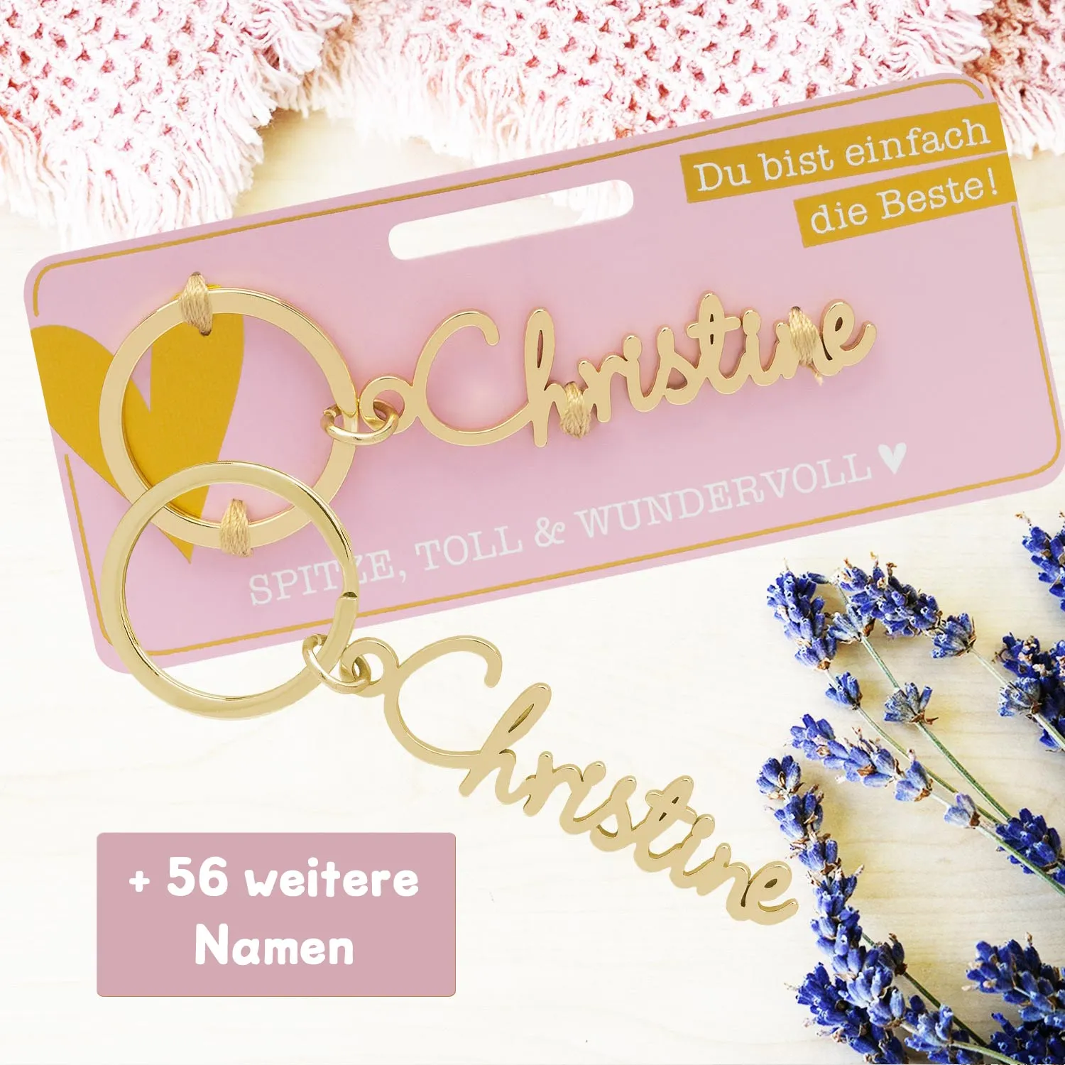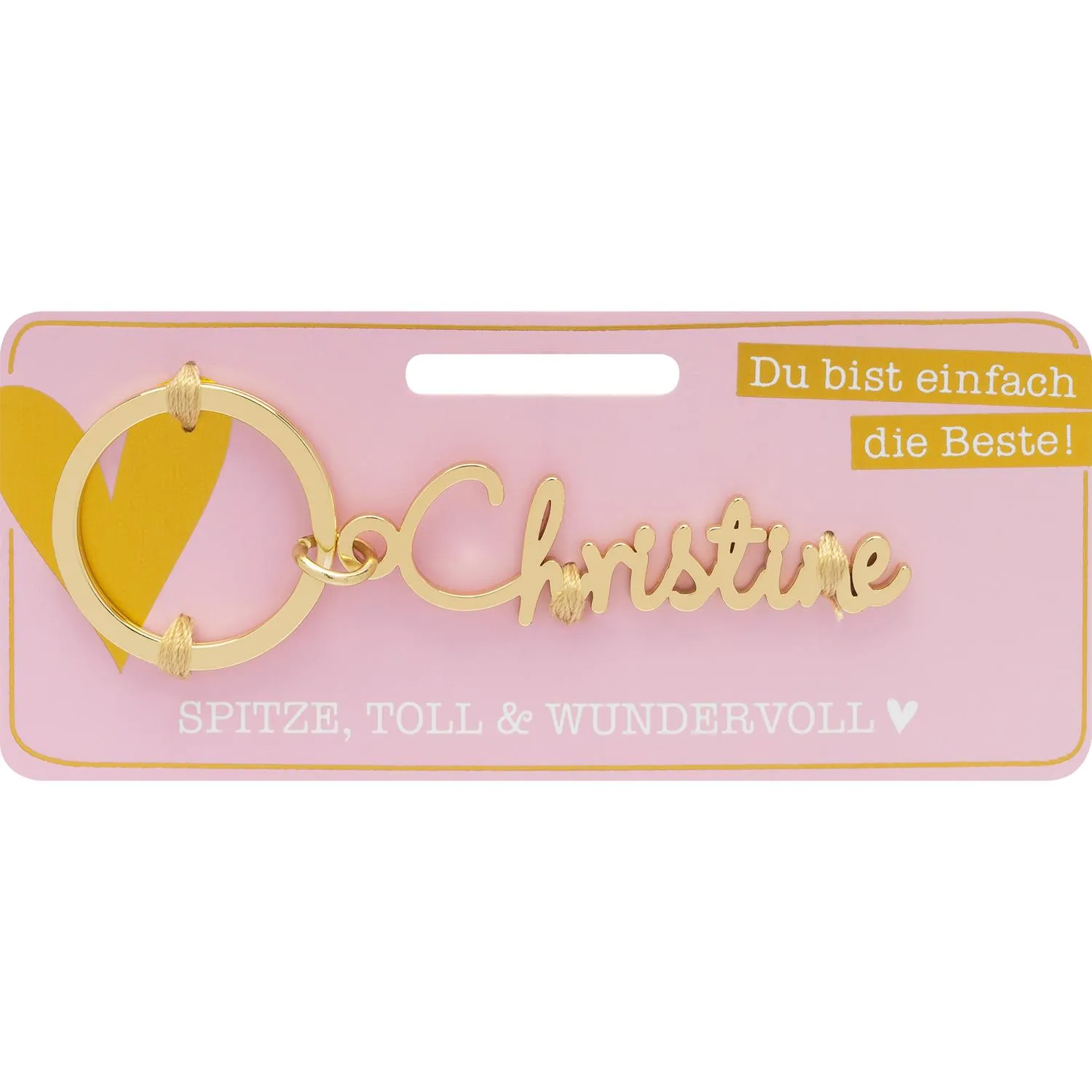 Der Name Christine ist eine Variante des Namens Christina und hat ebenfalls einen griechischen Ursprung. Er bedeutet "die Christin" oder "die Gesegnete". Frauen mit diesem Namen sind oft sehr liebevoll und haben eine warme Ausstrahlung. Sie sind auch sehr verantwortungsbewusst und zuverlässig. Christines sind bekannt für ihre Fürsorge und ihre Fähigkeit, andere Menschen zu unterstützen. Sie sind oft sehr organisiert und haben eine natürliche Führungsqualität. Mit einem Namensschlüsselanhänger mit dem Namen Christine kannst Du Deine Liebe und Verlässlichkeit zum Ausdruck bringen.