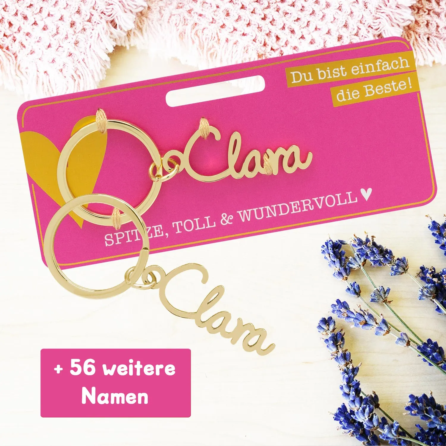 - Metallschriftzug inkl. Schlüsselring auf Headerkarte