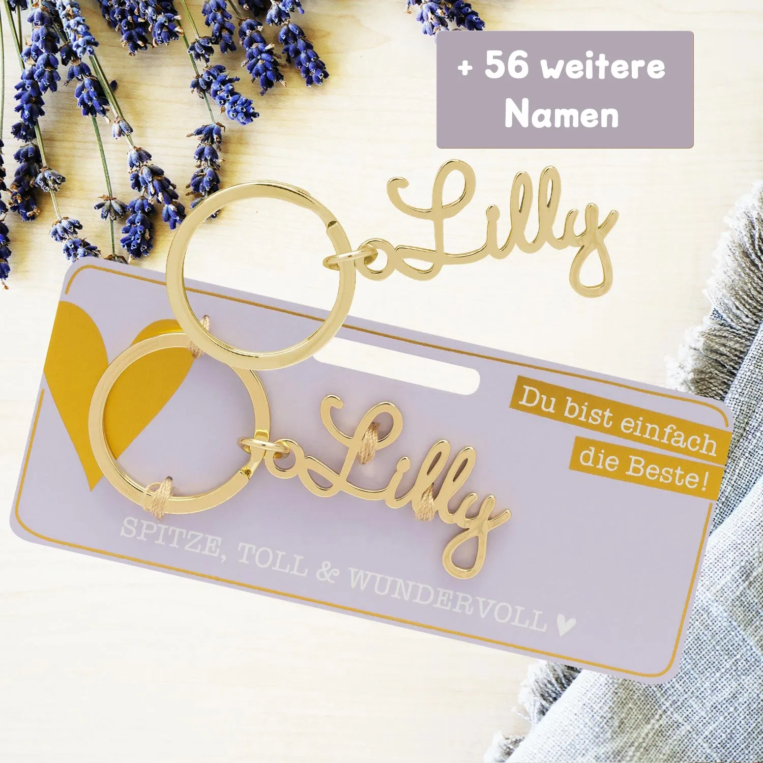 - Metallschriftzug inkl. Schlüsselring auf Headerkarte