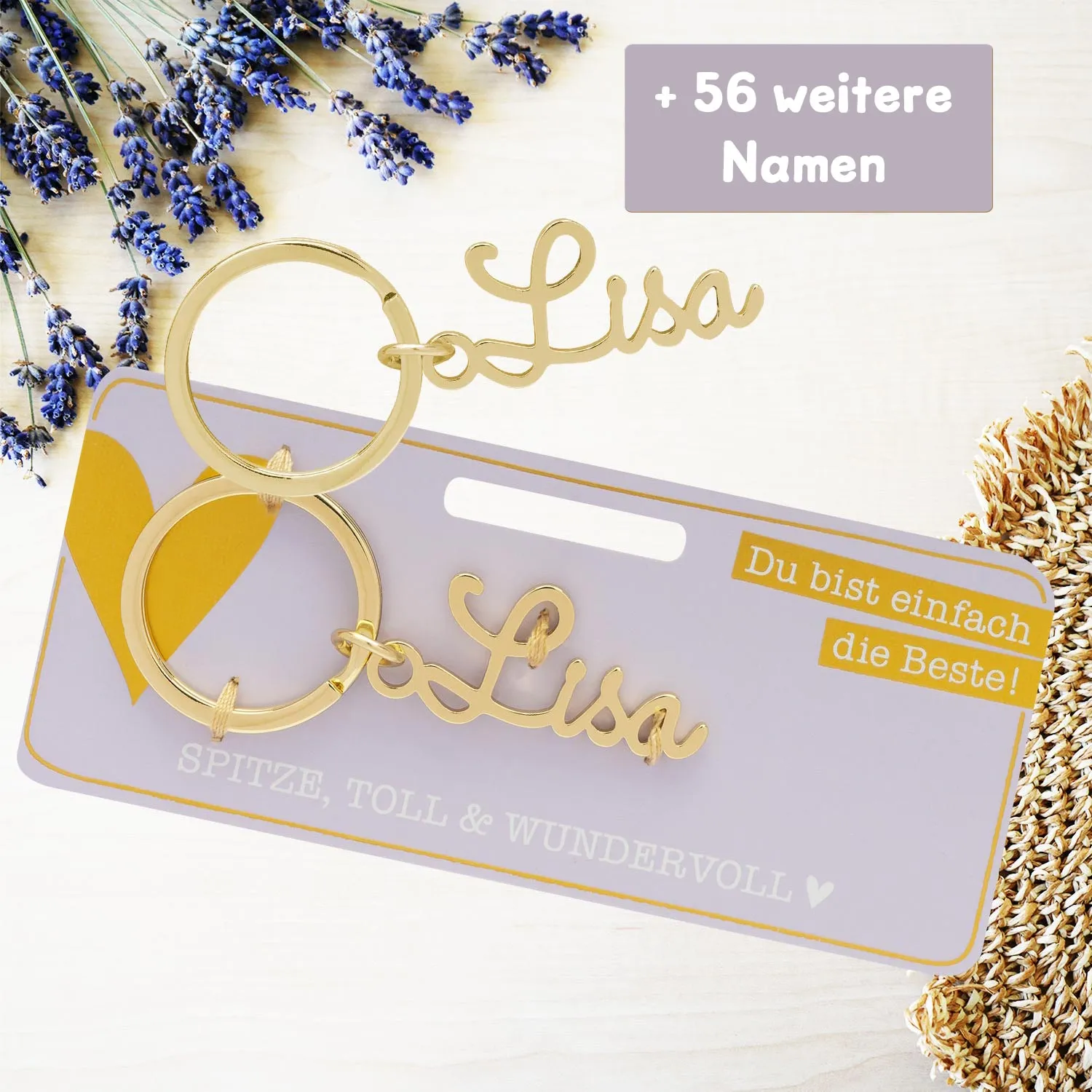 - Metallschriftzug inkl. Schlüsselring auf Headerkarte