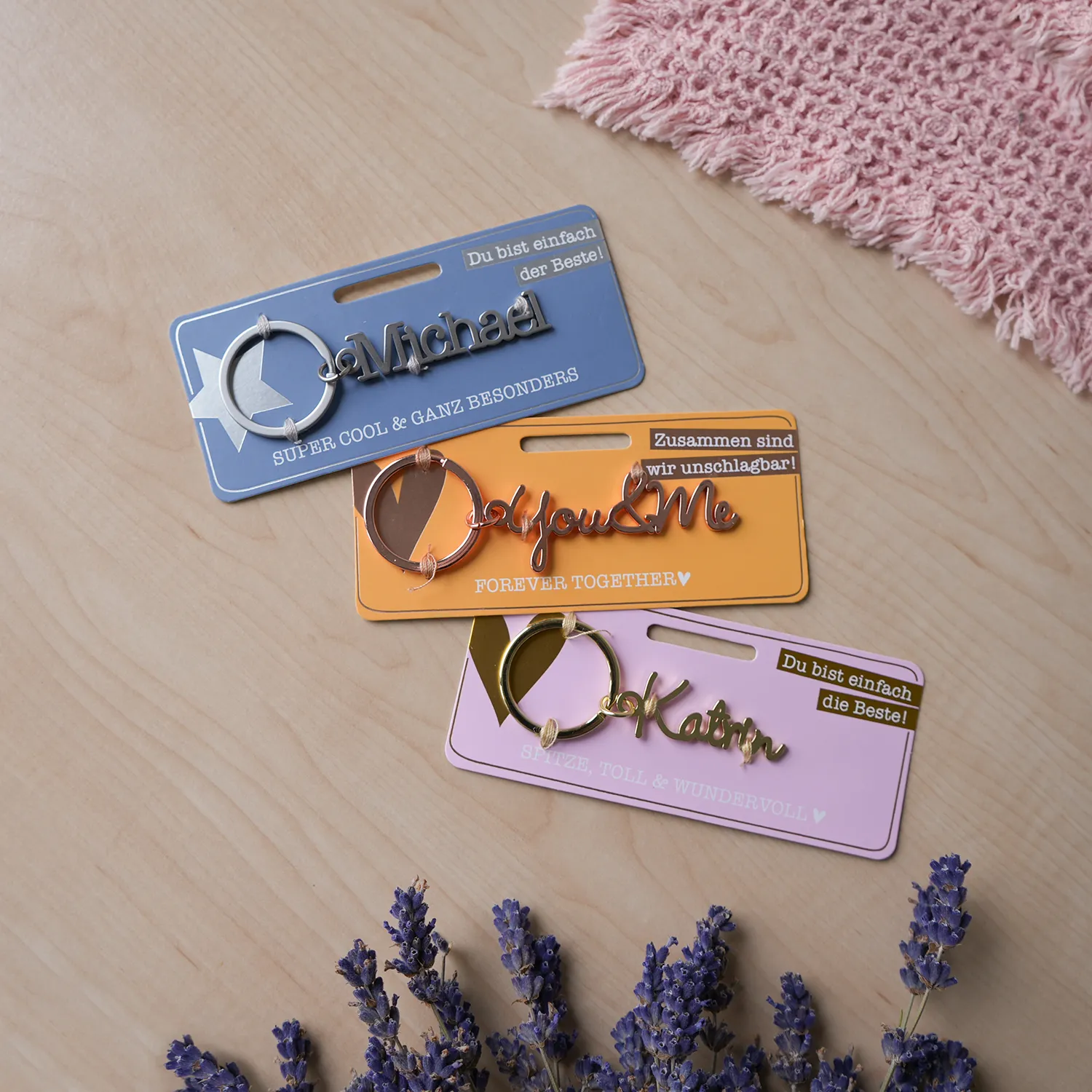 - Metallschriftzug inkl. Schlüsselring auf Headerkarte