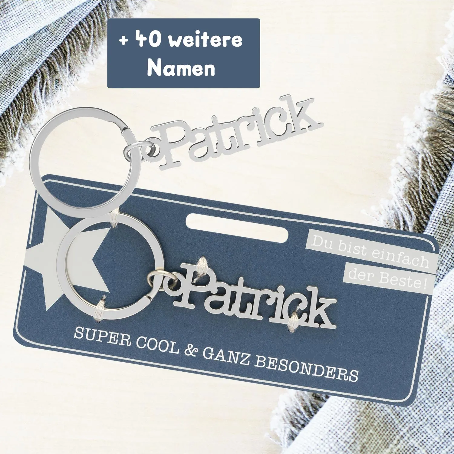- Metallschriftzug inkl. Schlüsselring auf Headerkarte