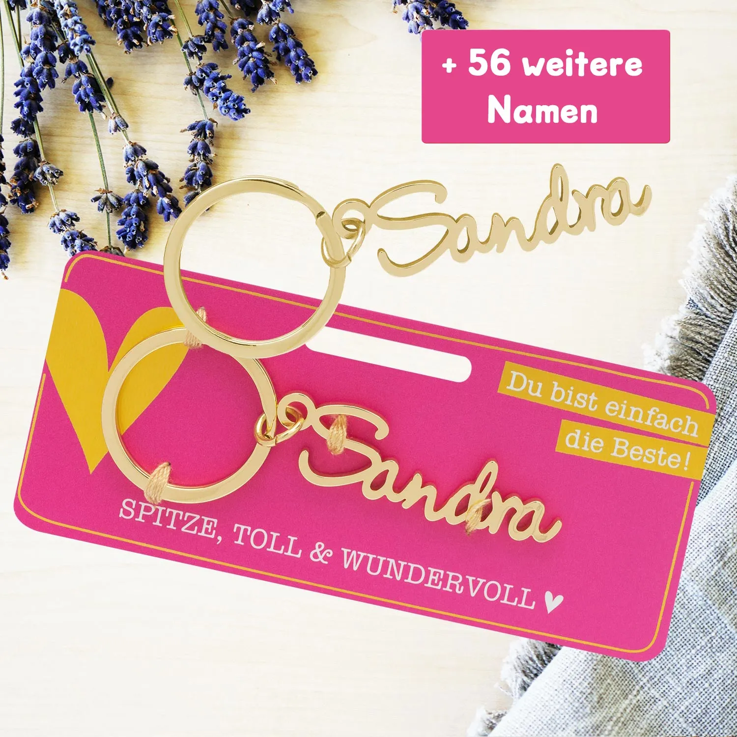 - Metallschriftzug inkl. Schlüsselring auf Headerkarte