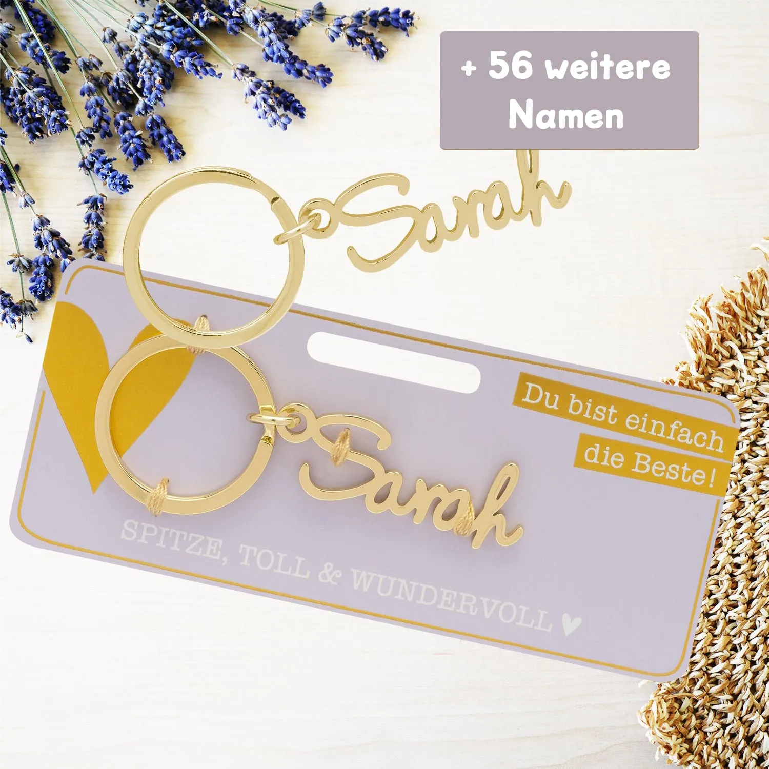 - Metallschriftzug inkl. Schlüsselring auf Headerkarte
