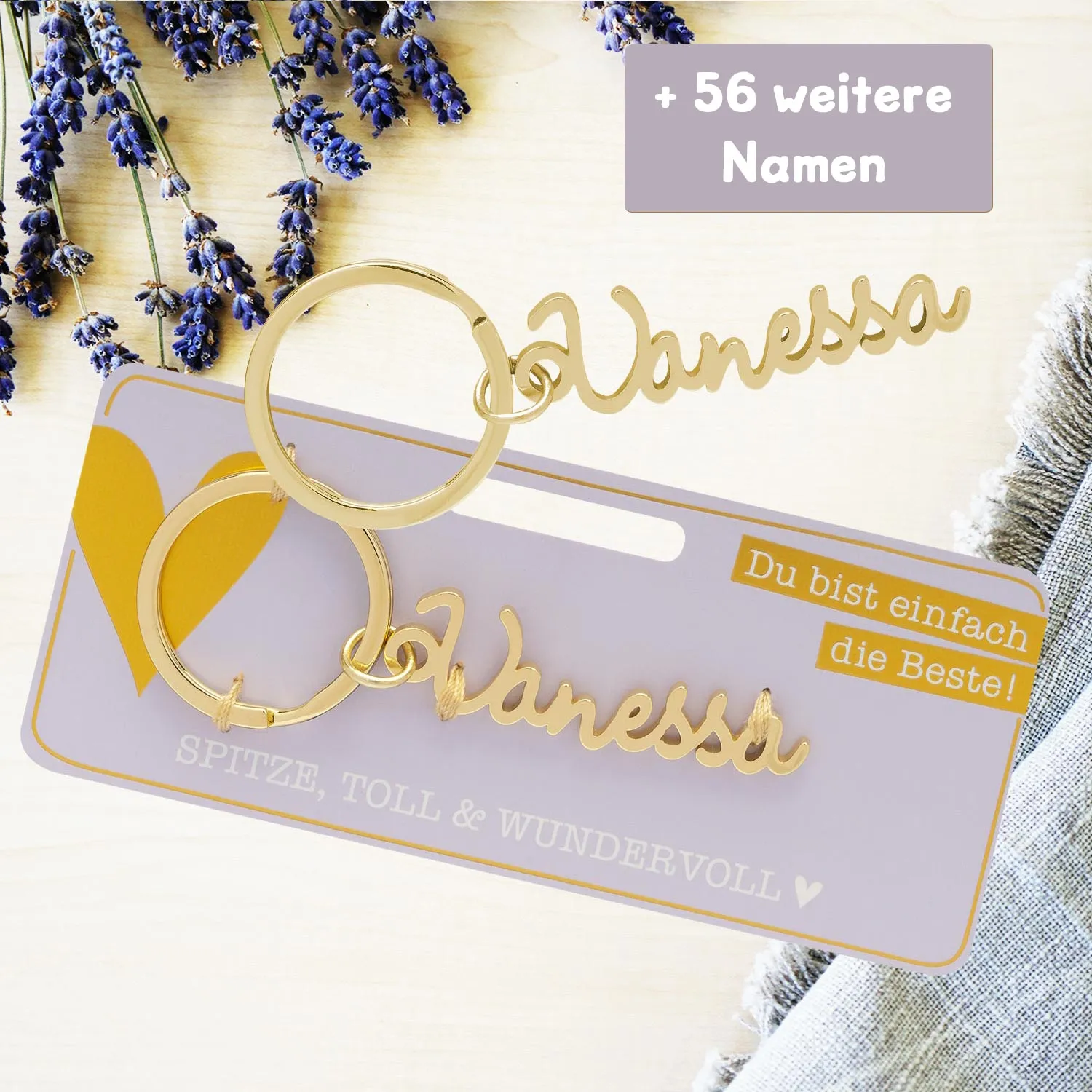 Der Name Vanessa hat einen griechischen Ursprung und bedeutet "die Schmetterlingsfrau" oder "die Anmutige". Frauen mit diesem Namen sind oft sehr charmant und haben eine natürliche Ausstrahlung. Sie sind auch sehr einfühlsam und haben ein großes Herz für andere Menschen. Vanessas sind bekannt für ihre Großzügigkeit und ihre Fähigkeit, anderen zu helfen. Sie sind oft sehr verantwortungsbewusst und zuverlässig. Mit einem Namensschlüsselanhänger mit dem Namen Vanessa kannst Du Deine Anmut und Großzügigkeit zum Ausdruck bringen.