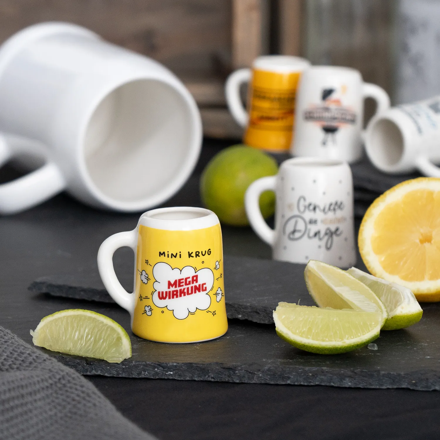 Unser Schnapskrug 'Mini Krug - Mega Wirkung' im fröhlichen gelben Comic-Design bringt Spaß und gute Laune in jede Runde. Der lebhafte Look passt perfekt zu der kraftvollen Botschaft: Auch die kleinsten Momente können großartig sein. Ein ideales Geschenk für alle, die wissen, dass wahre Größe oft im Detail steckt!