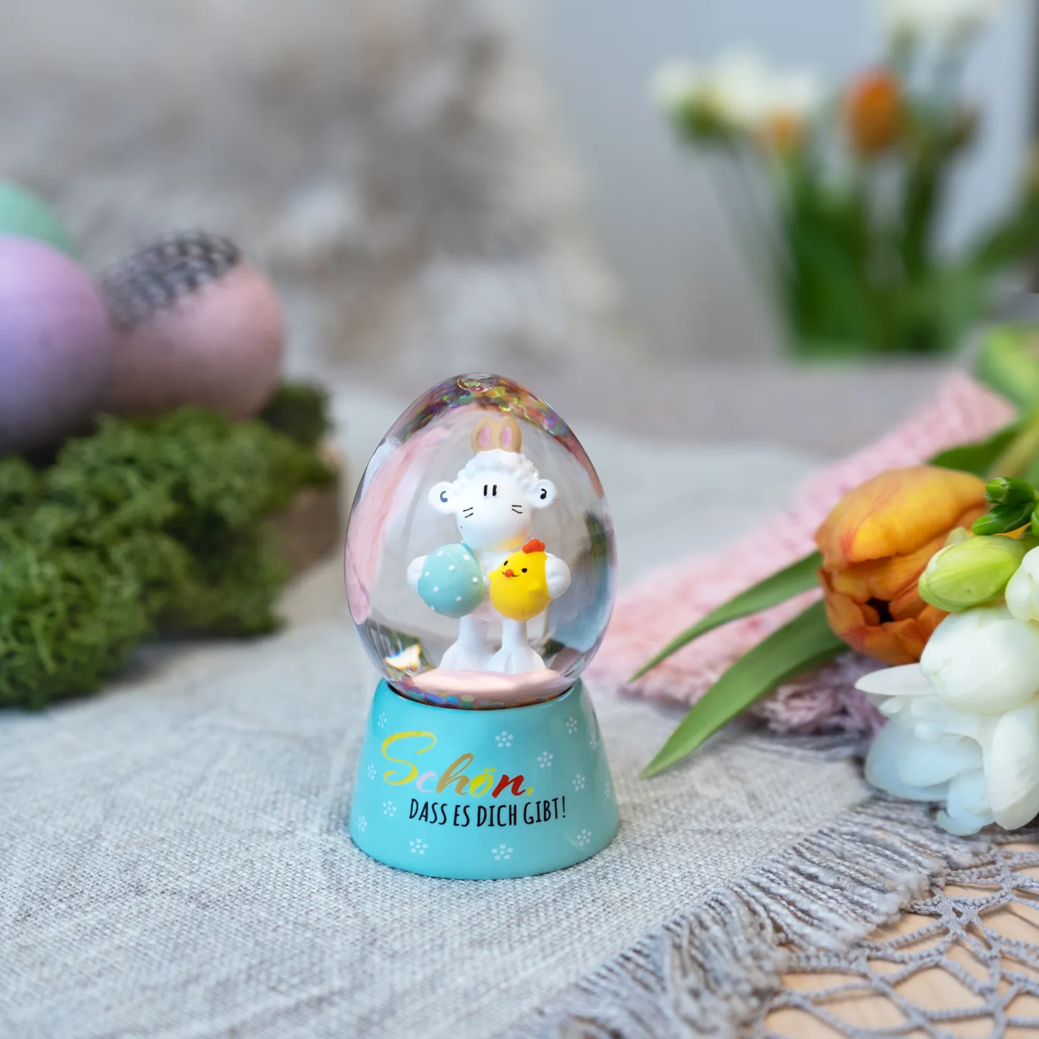 Diese Schneekugel ist ein tolles Geschenk für alle sheepworld Fans. Das niedliche Schaf hält ein Ei und ein kleines Küken in seinen Armen und zeigt Dir, wie sehr sie Dich lieben. Die Schneekugel ist in Ei-Form gestaltet und enthält Glitter, der beim Schütteln glitzert. Mit dem Spruch “Schön, dass es dich gibt” bringst Du Deine Wertschätzung zum Ausdruck und zauberst ein Lächeln auf das Gesicht des Beschenkten.