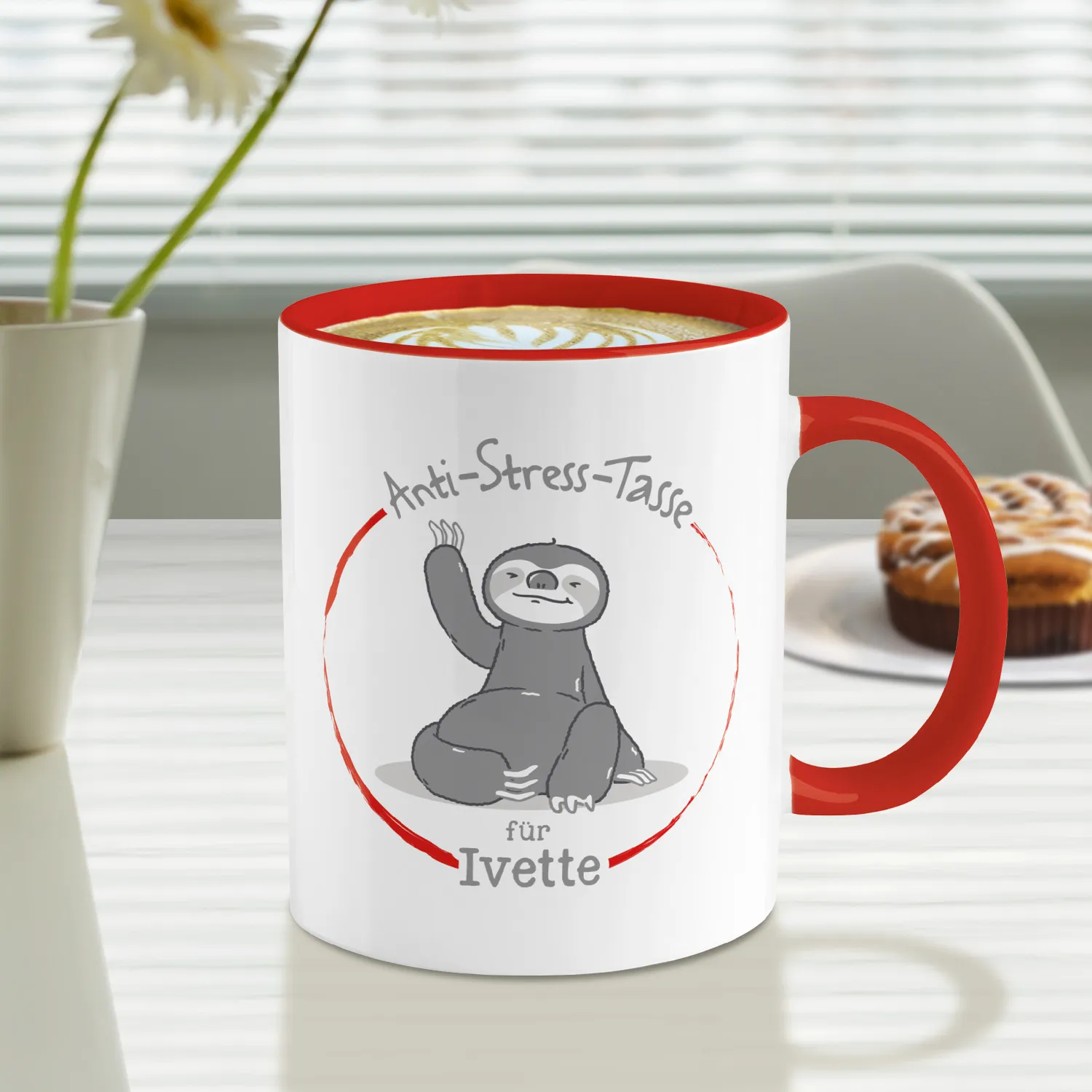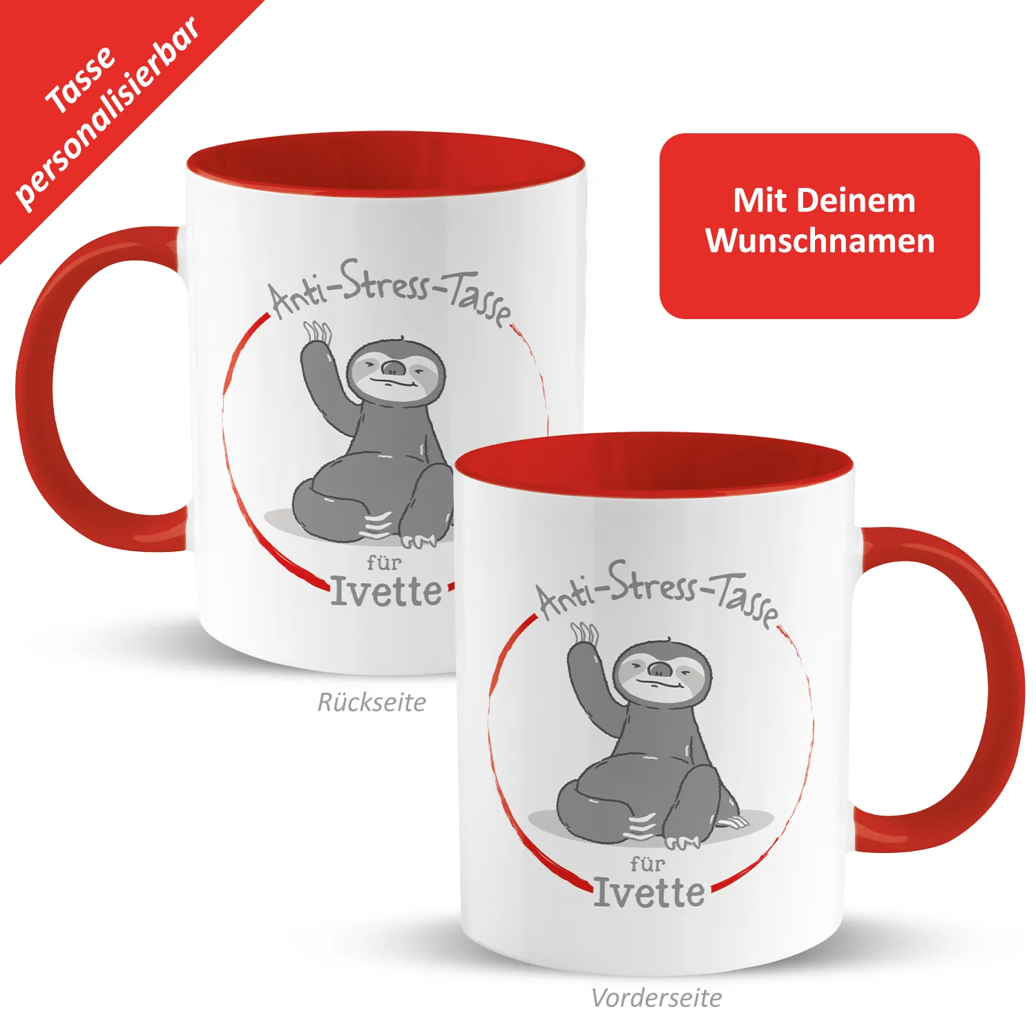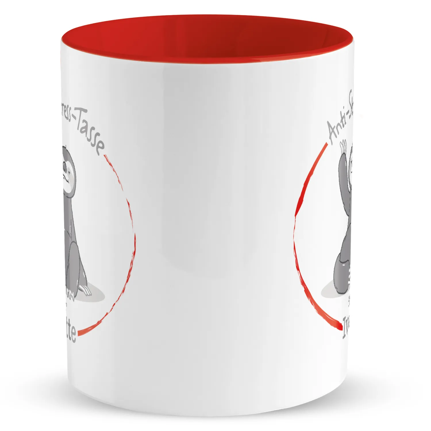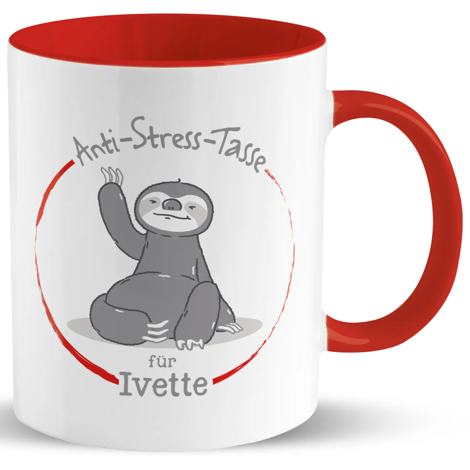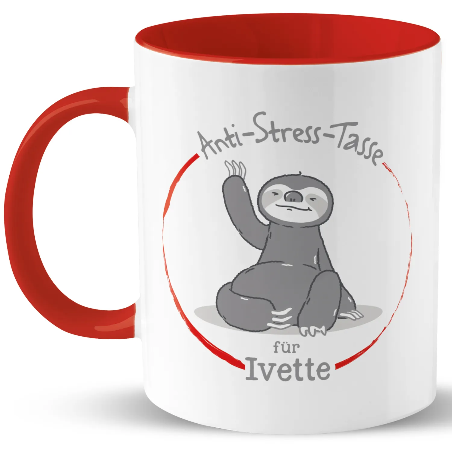 Hektischer Alltag, harter Job und dann noch dieser Freizeitstress - manchmal kann das Leben ganz schön stressig sein. Da kommt die Anti-Stress-Tasse mit dem chilligen Faultier gerade recht. Einfach ein Kaffee- oder Teepäuschen mit der personalisierten Tasse einlegen und schon kann man neue Energie tanken. Somit schöpfst Du nicht nur neue Kraft, sondern mit dem bunten Innendruck und dem roten Farbakzent bringst Du sogar noch ein wenig Farbe in Deinen Alltag. Wunschnamen eines supergestressten Zeitgenossen in das Feld eingeben und perfektes Entspannungsgeschenk erhalten.