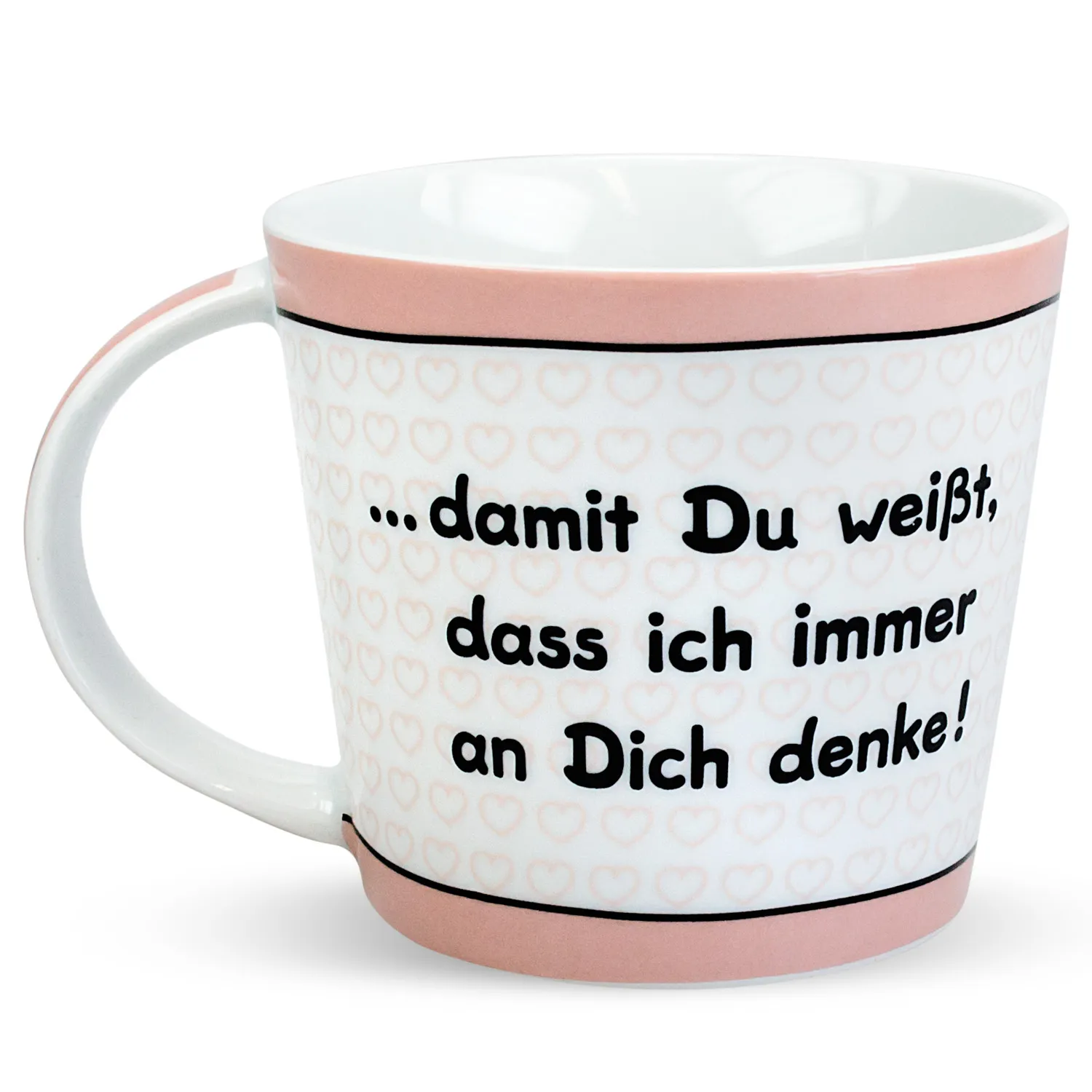 ...damit Du weißt, dass ich immer an Dich denke! - eine Botschaft bei dem jedem warm ums Herz wird! Die wunderschöne Tasse bezaubert mit zartem Rosa und ganz viel Herz!