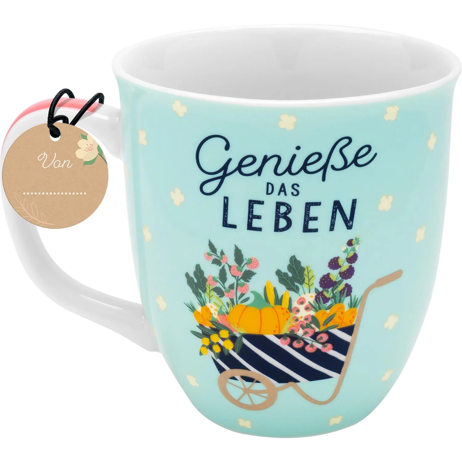 »Genieße das Leben« ist das Motto dieser stylischen Tasse im modernen Gartendesign! Ob nun beim Entspannen in der Sonne oder nach der Gartenarbeit, die liebevolle Botschaft im farbenfrohen Design garantiert bei jedem Getränk aus der Tasse ein Lächeln auf den Lippen.