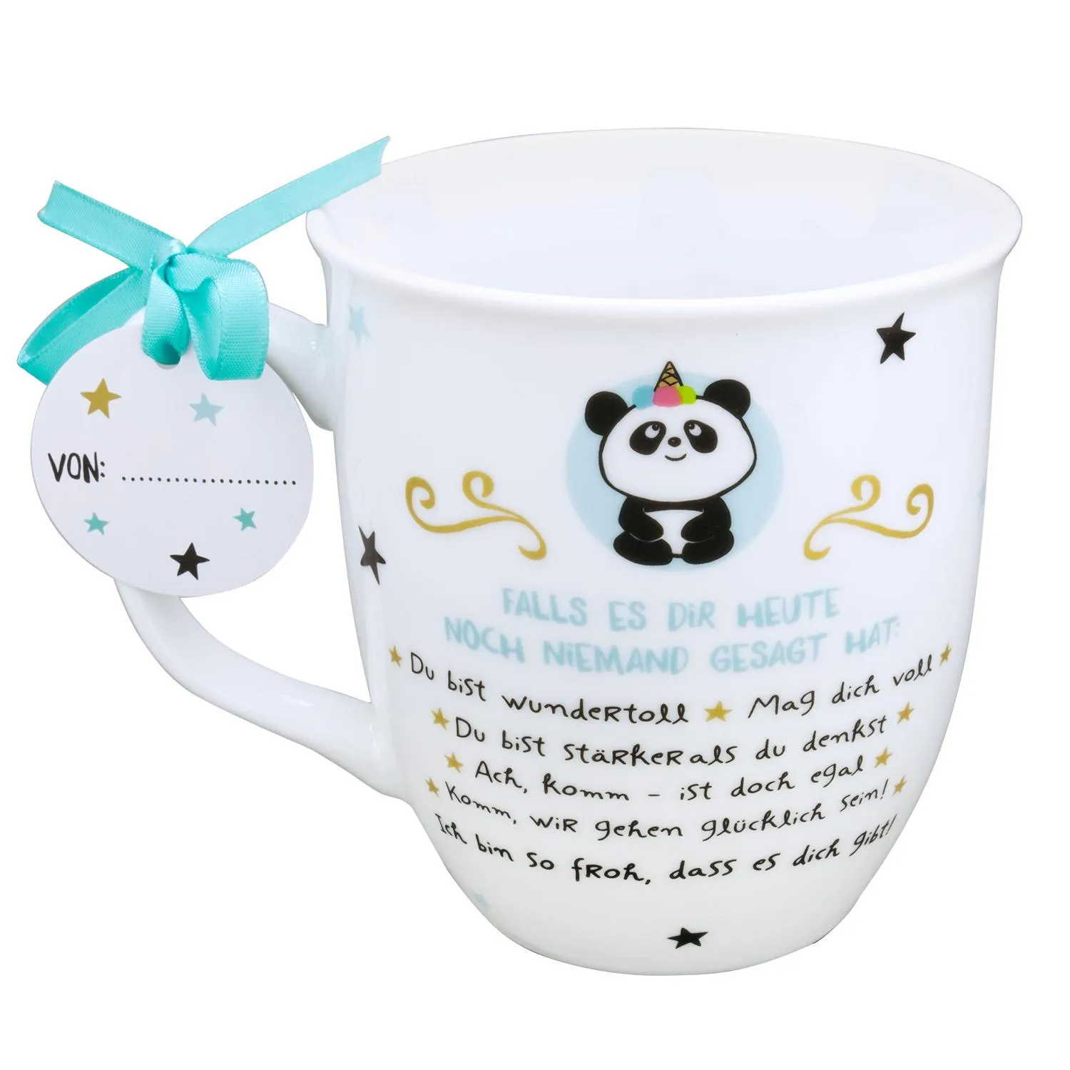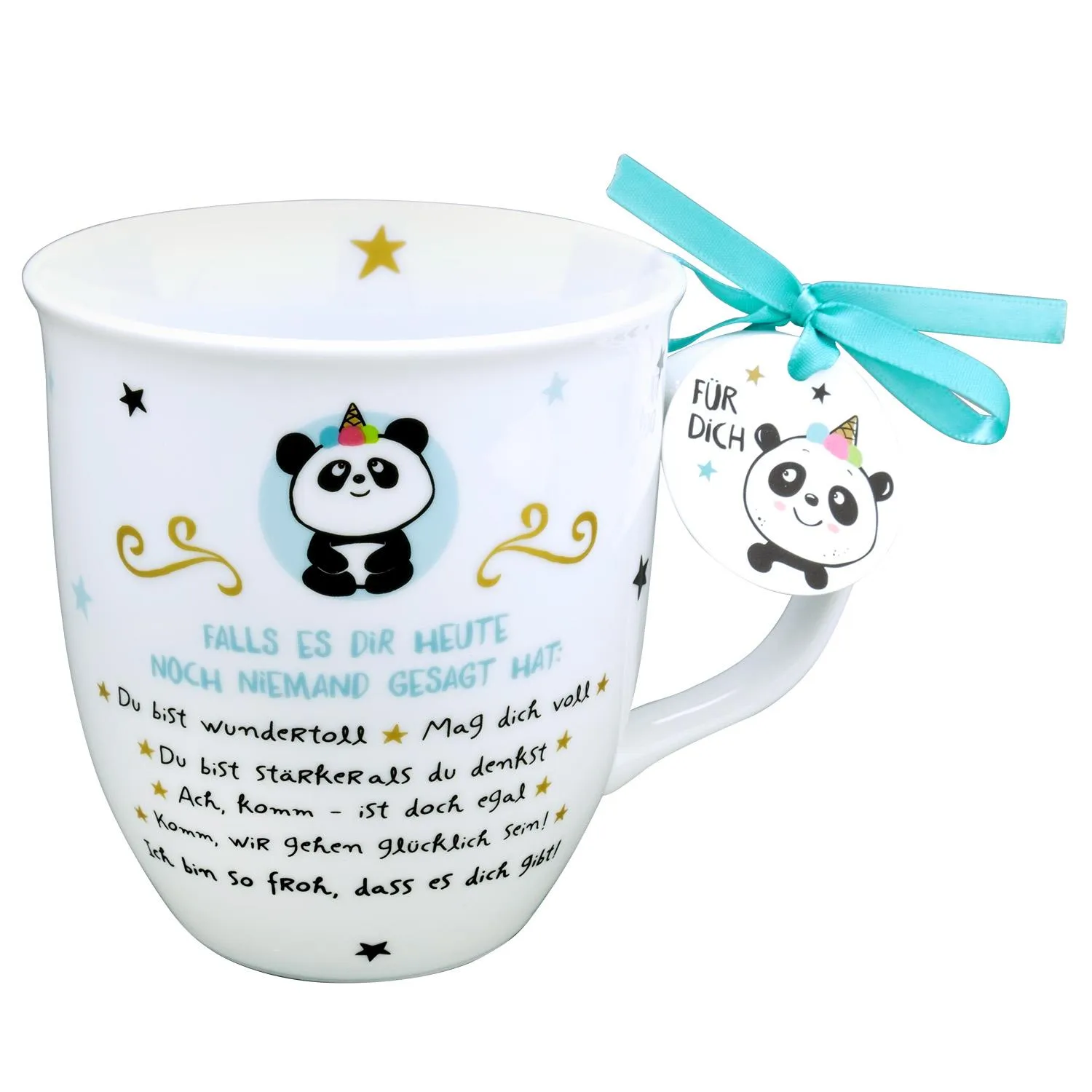Diese wunderschöne Tasse mit dem Panda ist ein optimales Geschenk für Deinen Lieblingsmenschen. Die von Herzen kommende Botschaft »Ich bin so froh, dass es dich gibt!« und die vielen anderen Komplimente sorgen beim Beschenkten für strahlende Augen.