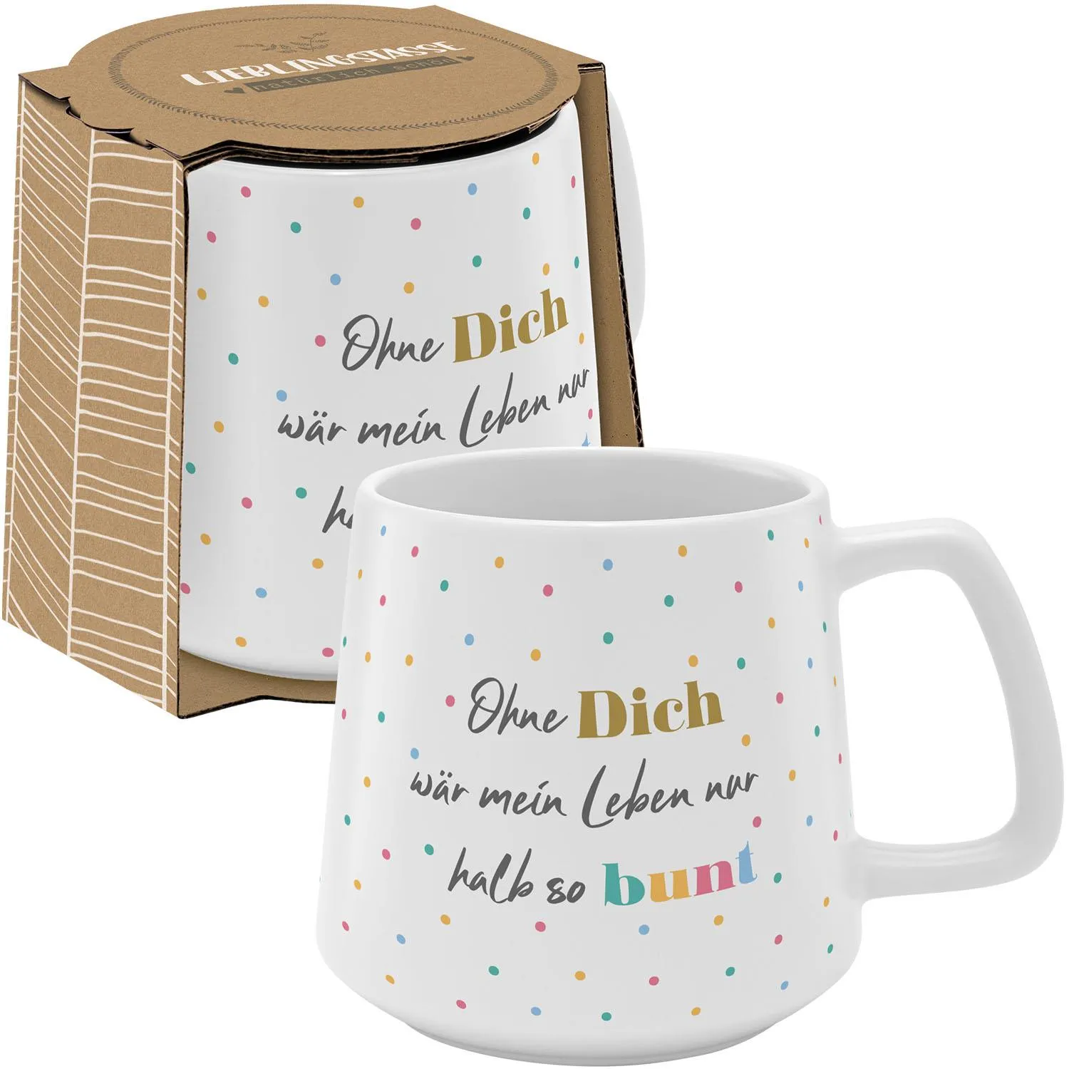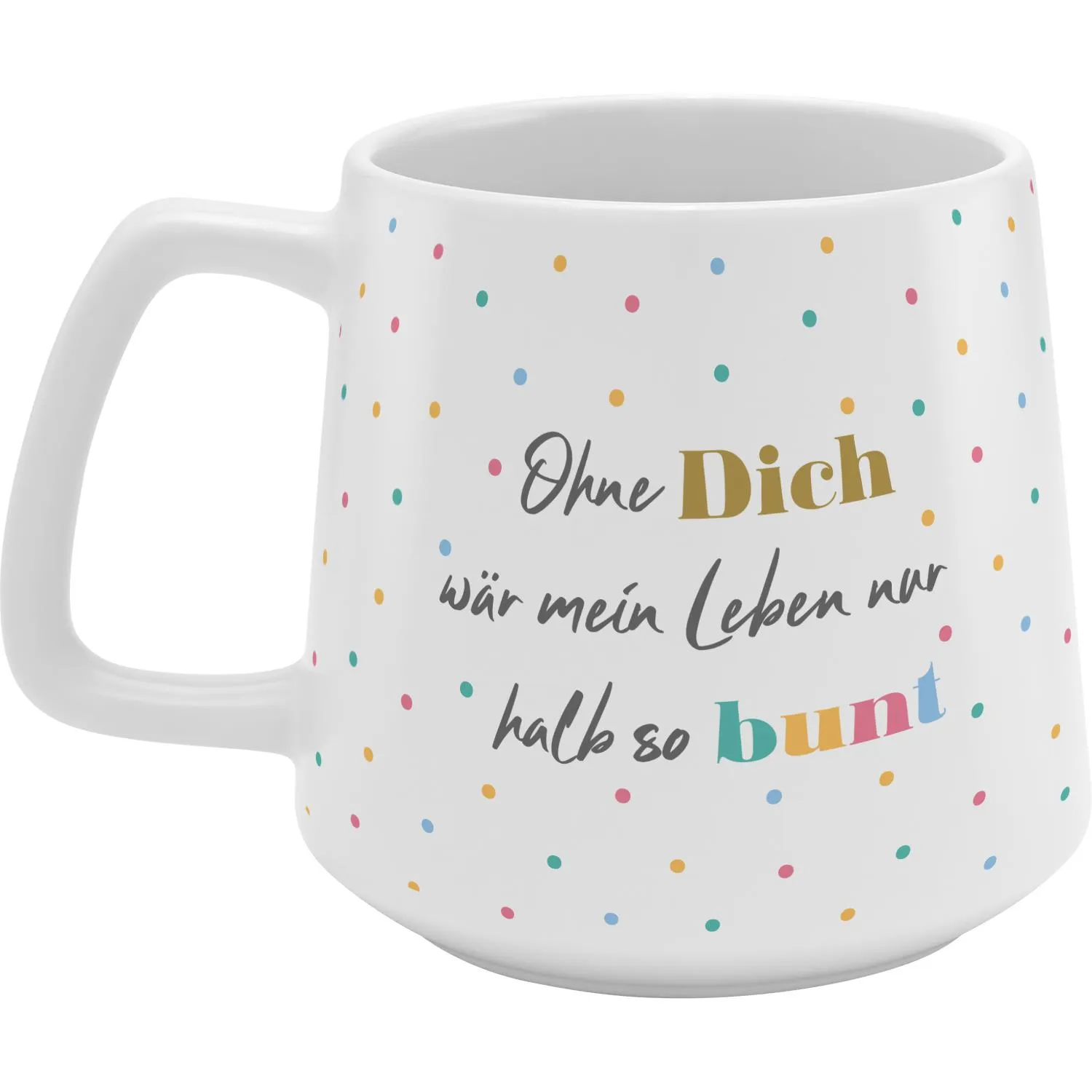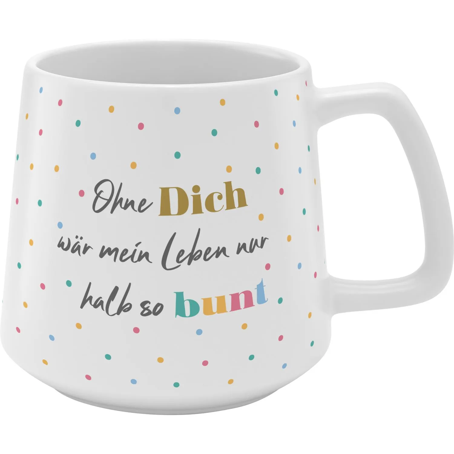 Unsere konische Tasse in matter Optik mit feiner Struktur und funkelndem Golddruck bringt die Botschaft 'Ohne Dich wäre mein Leben nur halb so bunt' auf besondere Weise zur Geltung. Die vielen kleinen Punkte auf der Tasse symbolisieren die bunten Momente, die ein geliebter Mensch ins Leben bringt. Ein perfektes Geschenk, das zeigt, wie wertvoll jemand ist und wie viel Farbe er in Deinen Alltag bringt.
