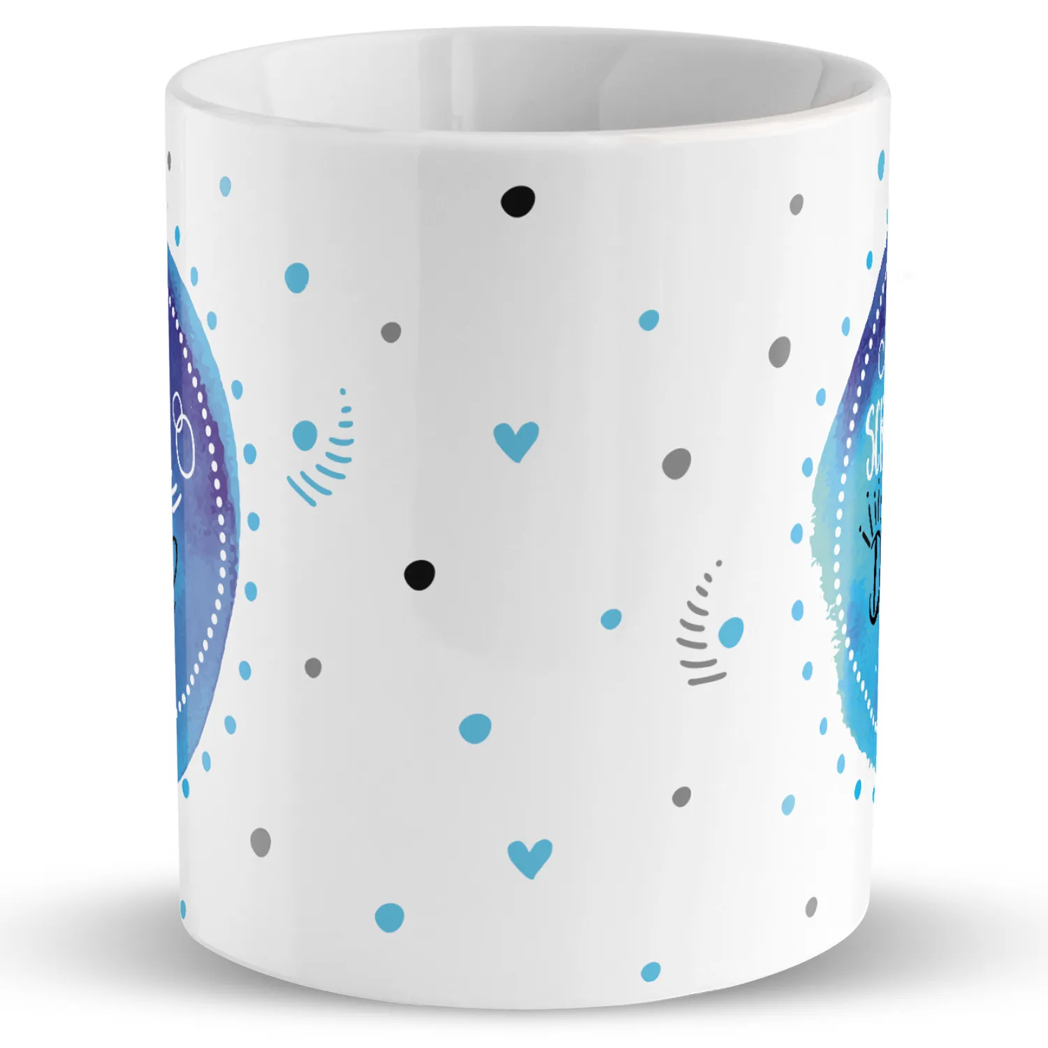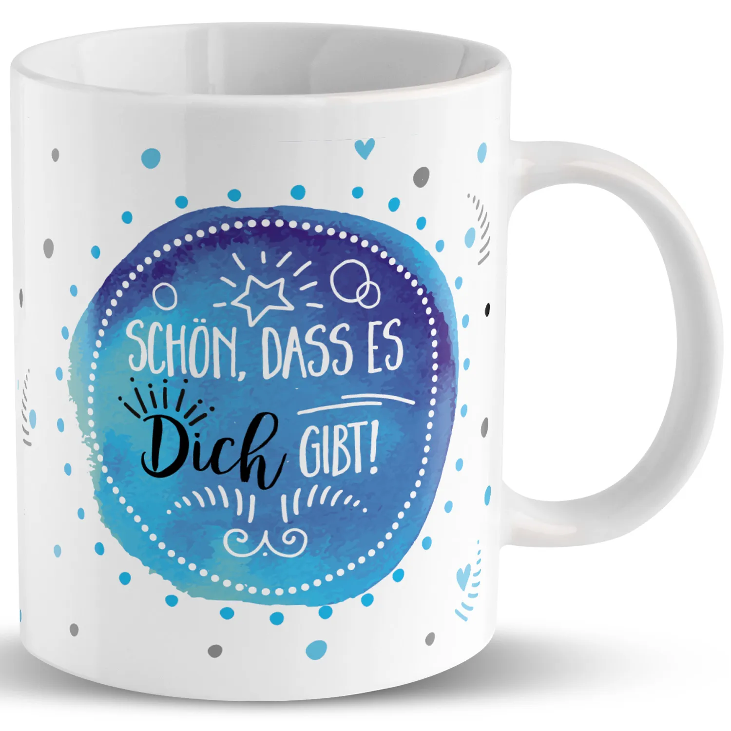 "»Schön, dass es Dich gibt!« - Dieses Kompliment lässt wirklich jedes """"Opa-Herz"""" höherschlagen. Diese personalisierte Tasse mit den schönen Blautönen macht beim täglichen Kaffee- oder Teetrinken eine gute Figur auf dem Küchentisch."