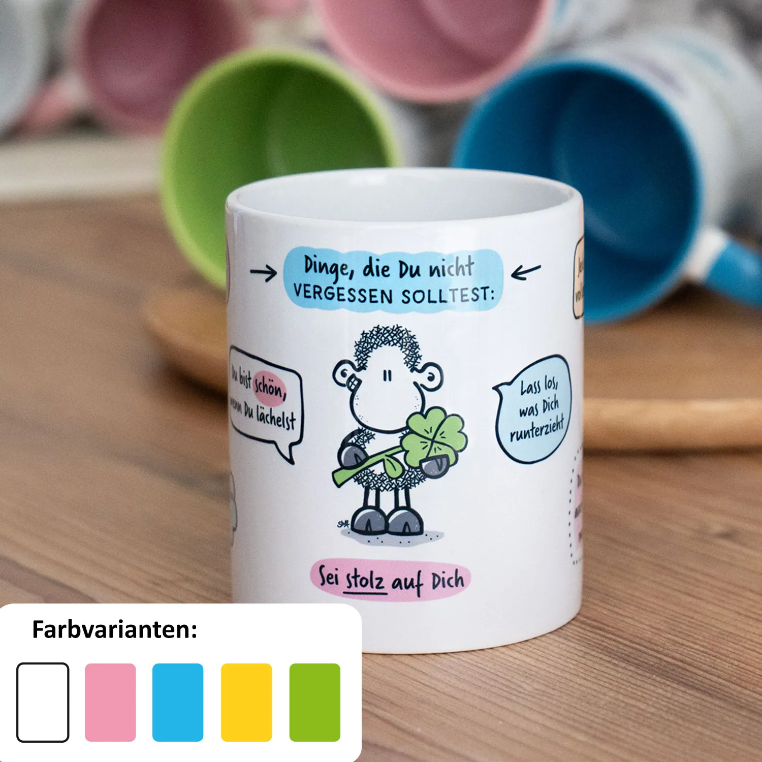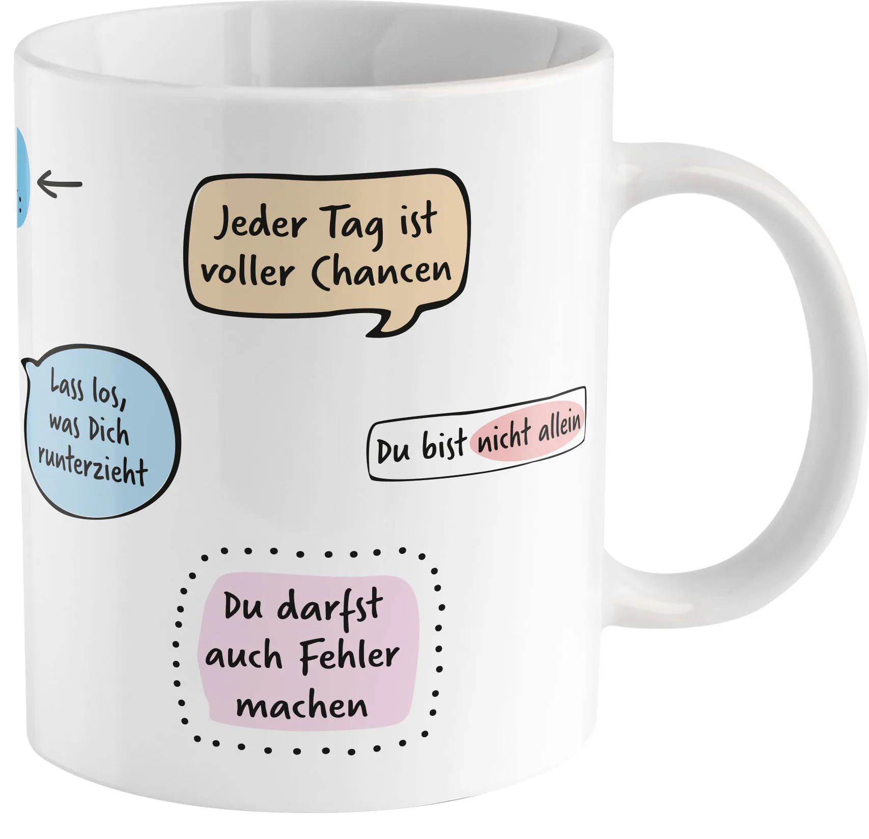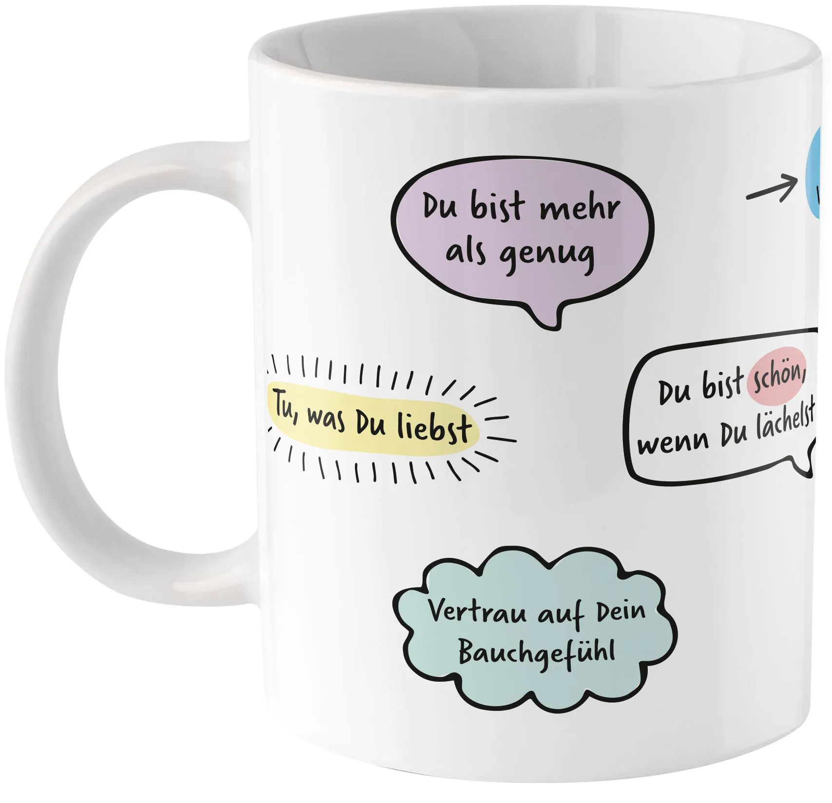Egal was passiert, vergiss nie: Du bist stark, du bist mutig und du bist liebenswert. Glaube an Dich selbst und an Deine Fähigkeiten, denn Du kannst alles erreichen, was Du Dir vornimmst. Diese Tasse soll Dich jeden Morgen daran erinnern, dass Du großartig bist und dass Du alles schaffen kannst. In den Farben weiß, gelb, grün, rosa und blau strahlt sie Dir entgegen und bringt sofort gute Laune in Deinen Tag. Lass Dich von den motivierenden Sprüchen inspirieren und starte voller Zuversicht in einen neuen Tag voller Möglichkeiten.