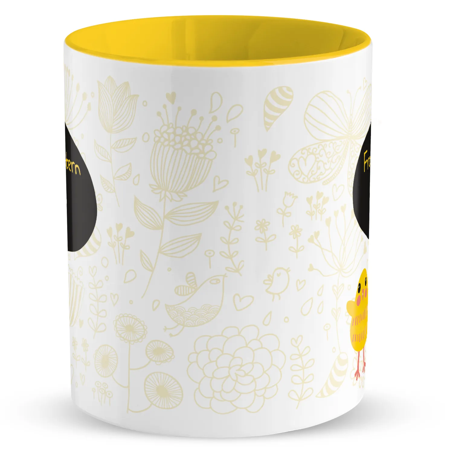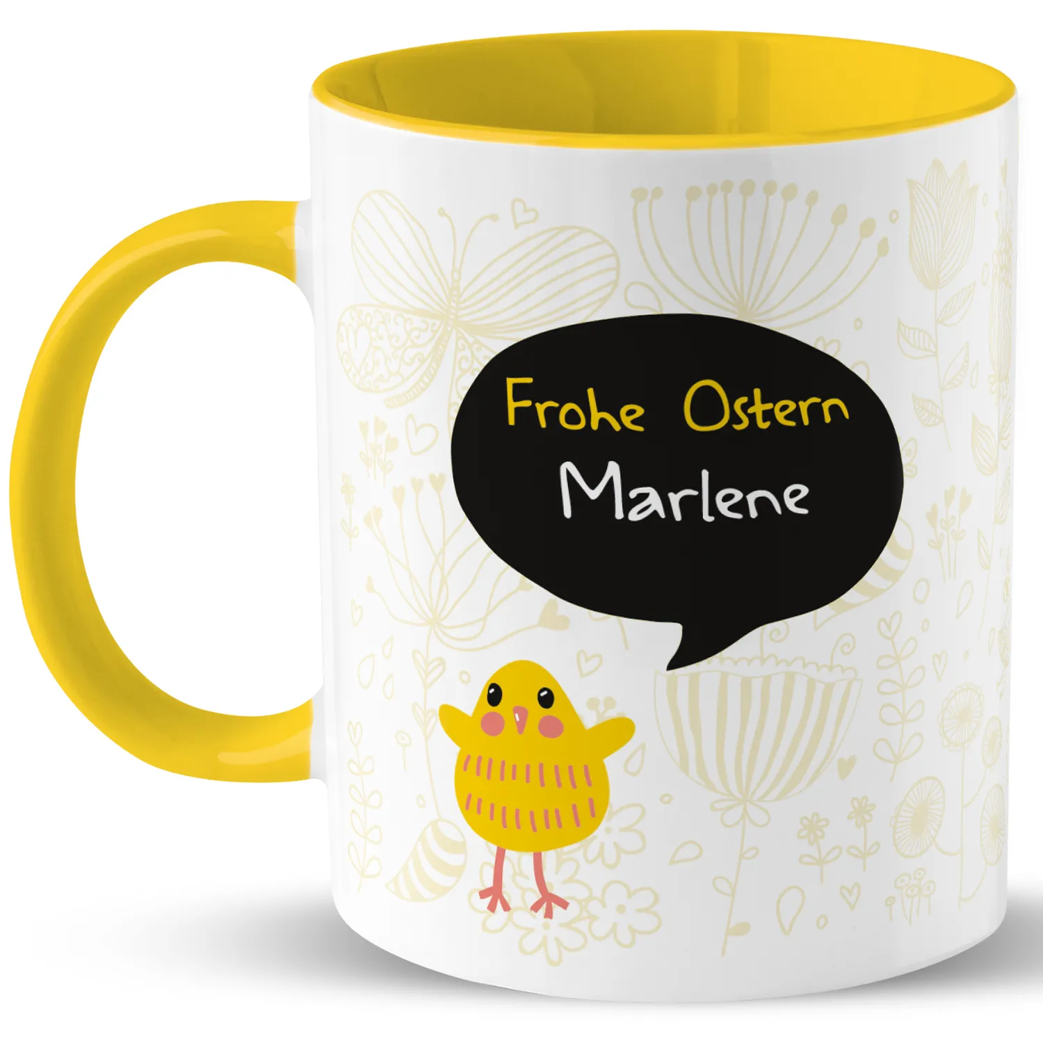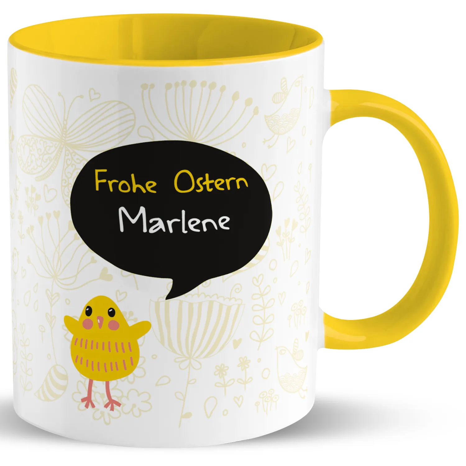 Ostergeschenk finden statt suchen! Die dekorative Tasse mit quietschgelbem Küken und zartem Doodle-Design bringt frühlingsfrische Osterstimmung auf den Tisch. Einfach Wunschnamen eingeben und personalisertes Ostergeschenk erhalten. Da wird sogar der Osterhase neidisch!