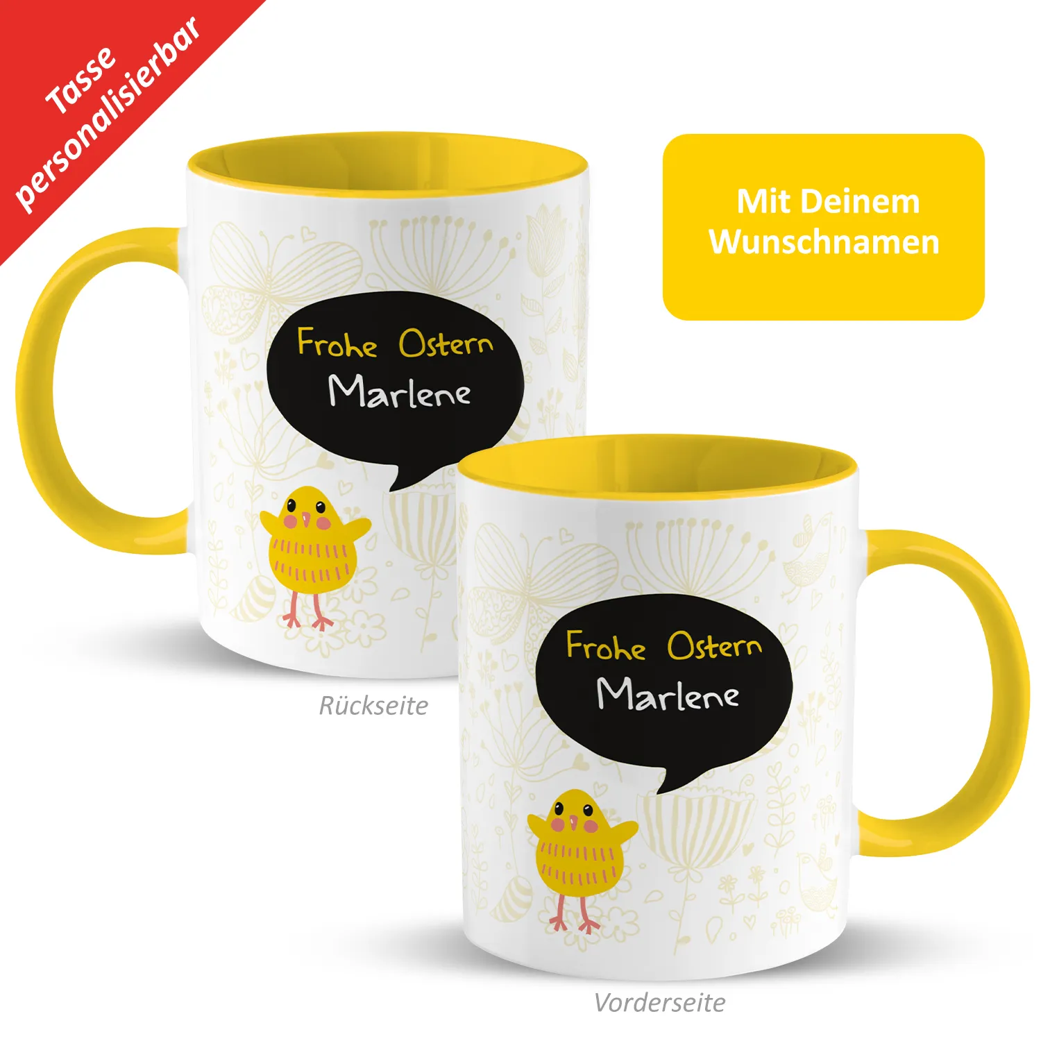 Tasse für Ostern »Frohe Ostern ...« mit Wunschnamen, gelb, personalisierbar