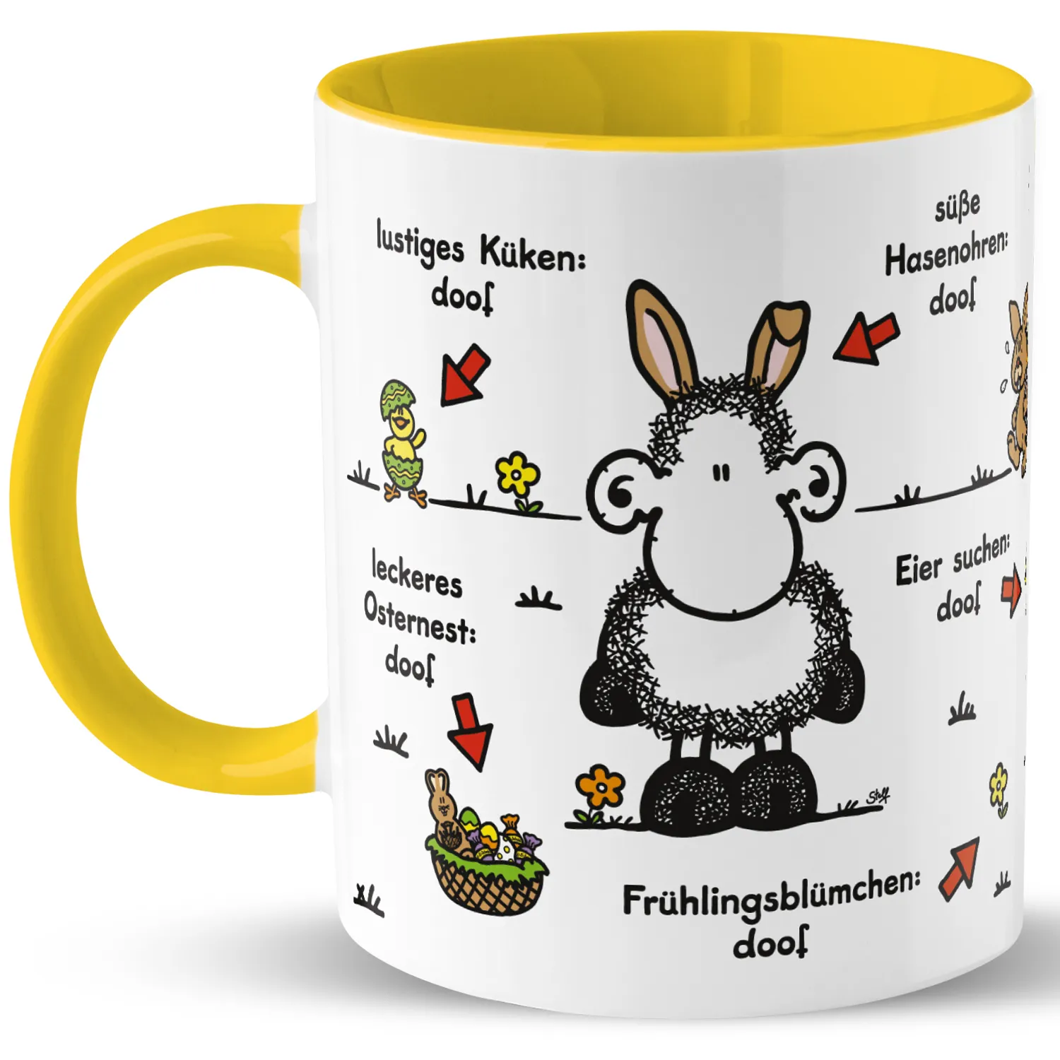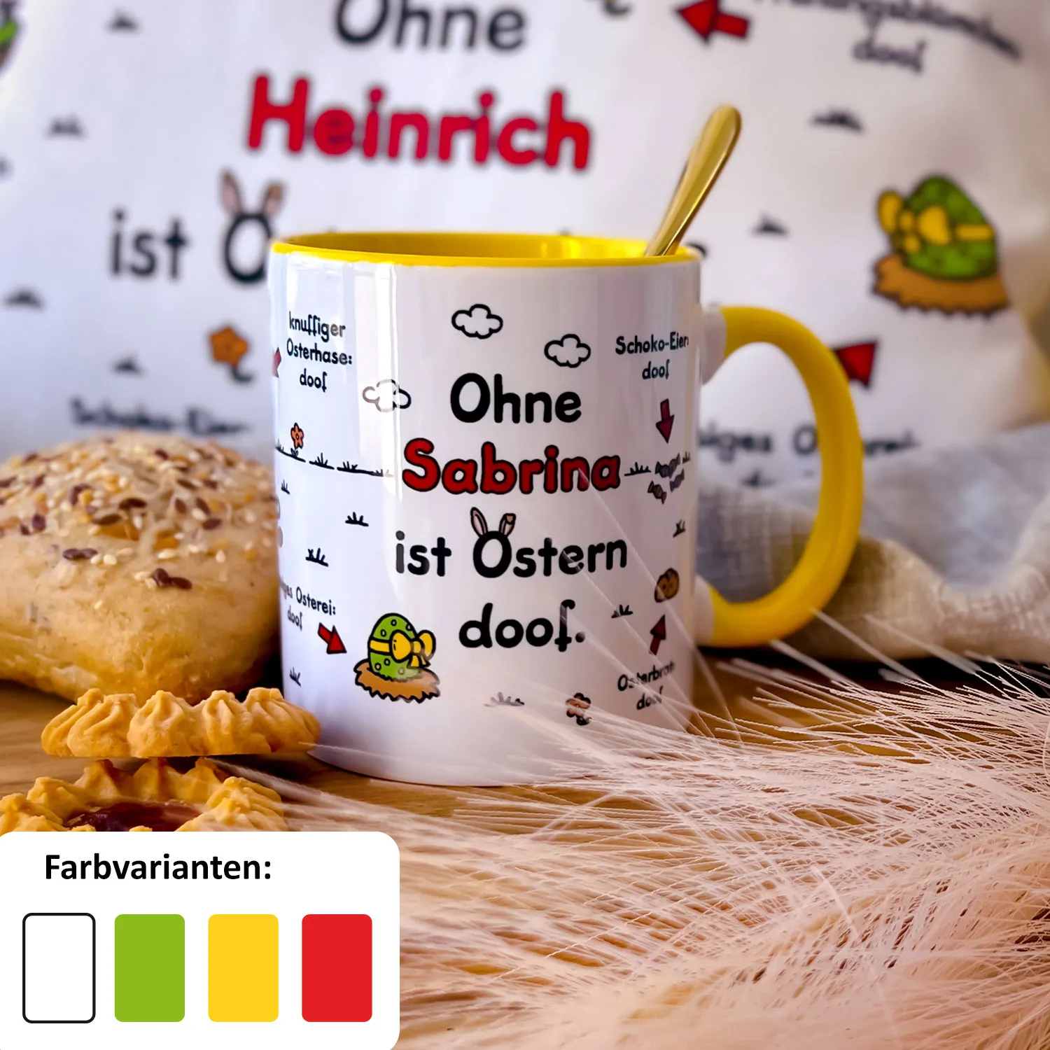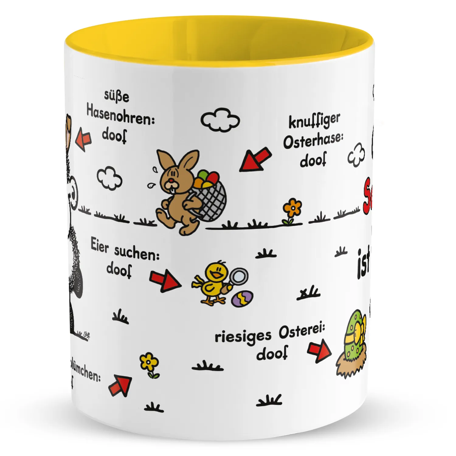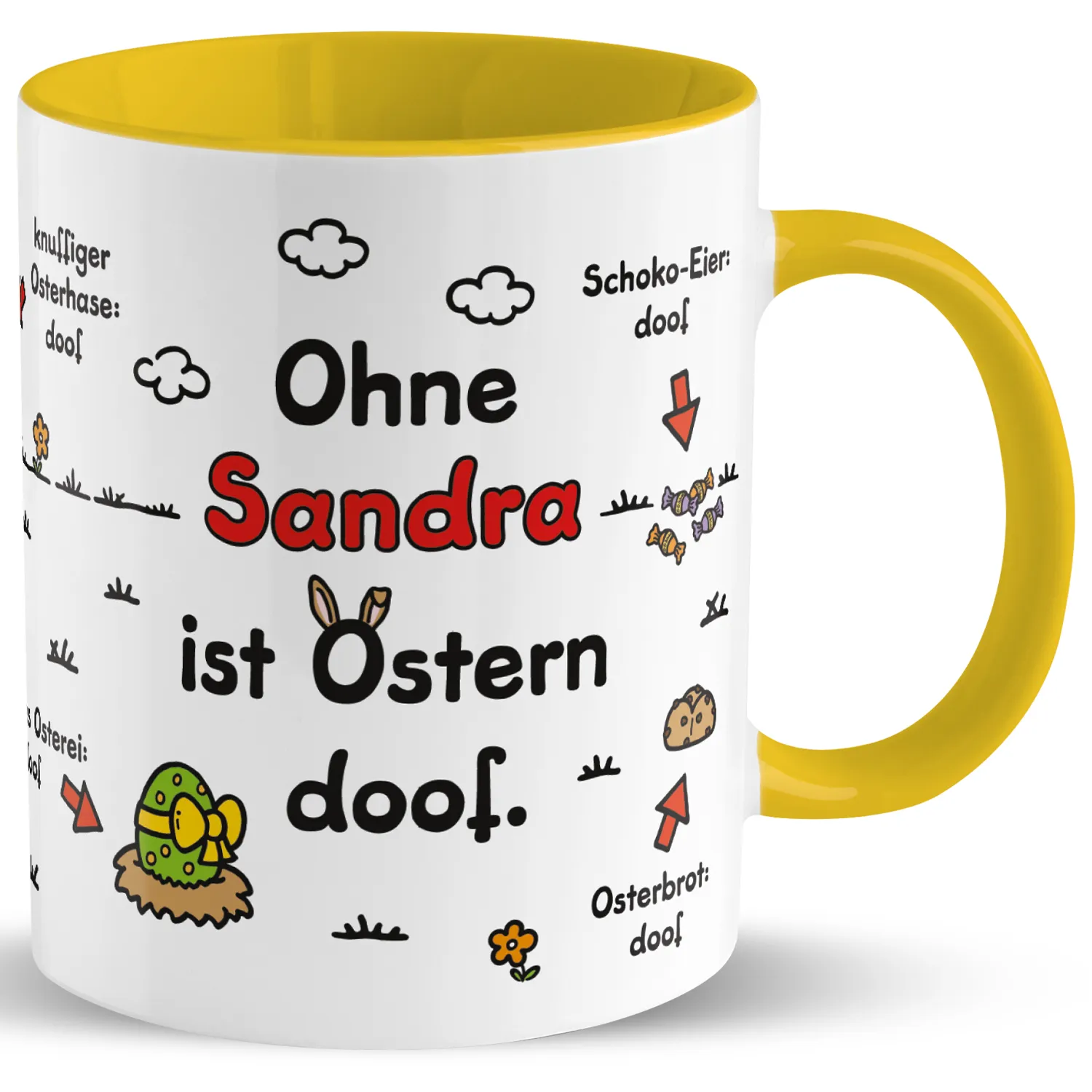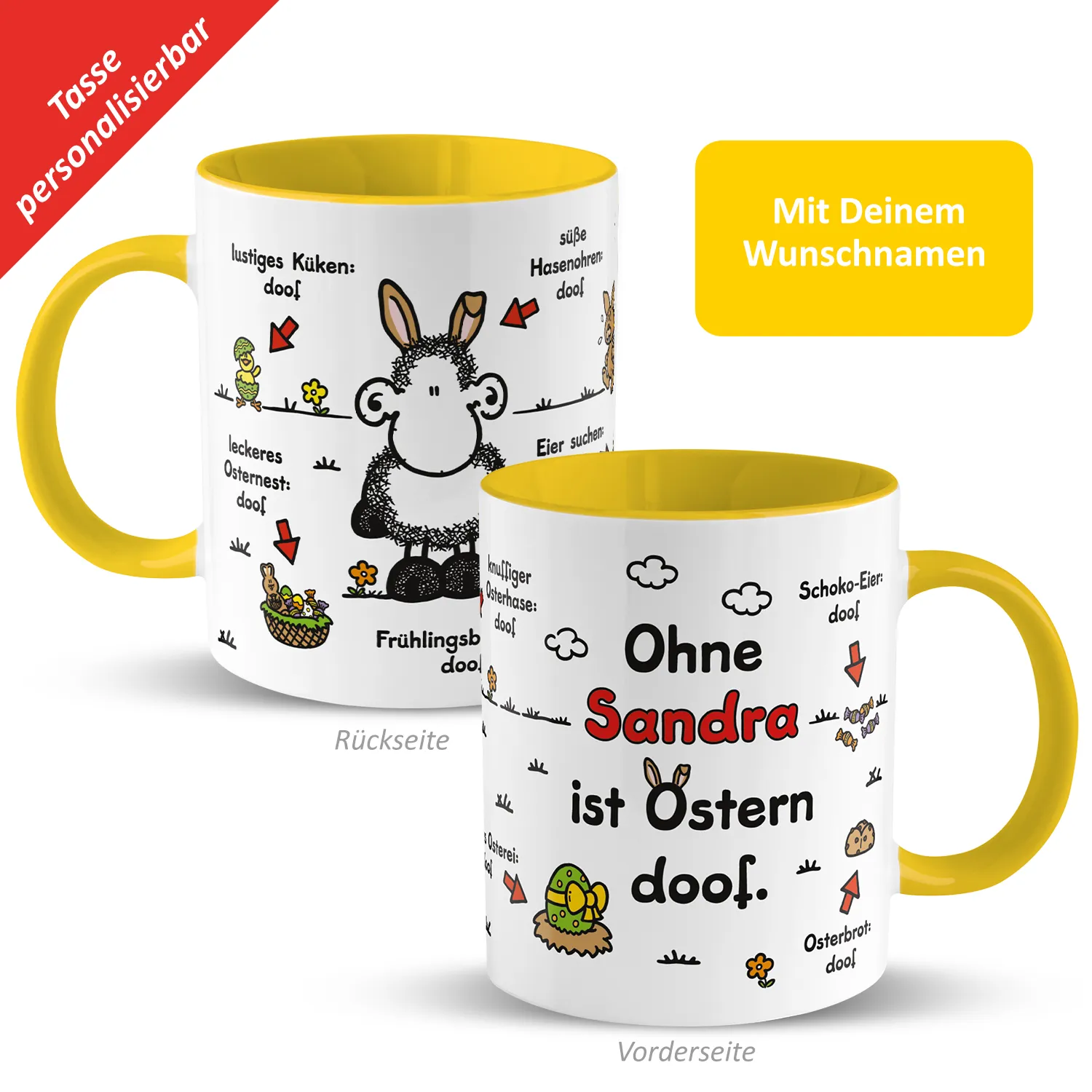 Tasse für Ostern »Ohne … ist Ostern doof.« mit Wunschnamen, gelb, personalisierbar