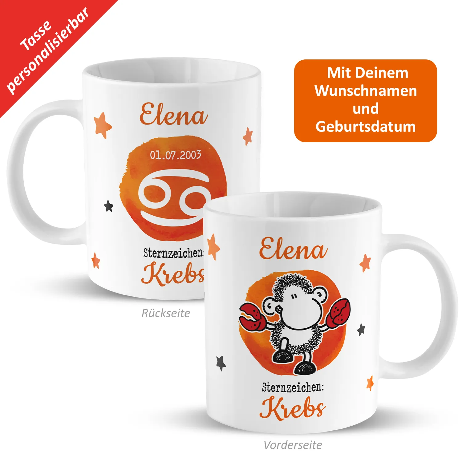 Jedem Sternzeichen schreibt man bestimmte Charaktereigenschaften zu, die sehr oft genau zutreffen. In Kombination mit dem eigenen Namen und dem persönlichen Geburtsdatum kreierst Du eine individuelle und einzigartige Geschenkidee, die etwas ganz Besonderes ist. Das liebevoll gestaltete Sternendesign mit dem sheepworld Kultschaf macht jeden Schluck aus dieser personalisierten Tasse zum Hochgenuss.Hinweis: Sternzeichen »Krebs« (Zeitraum: 22.06. - 22.07.)