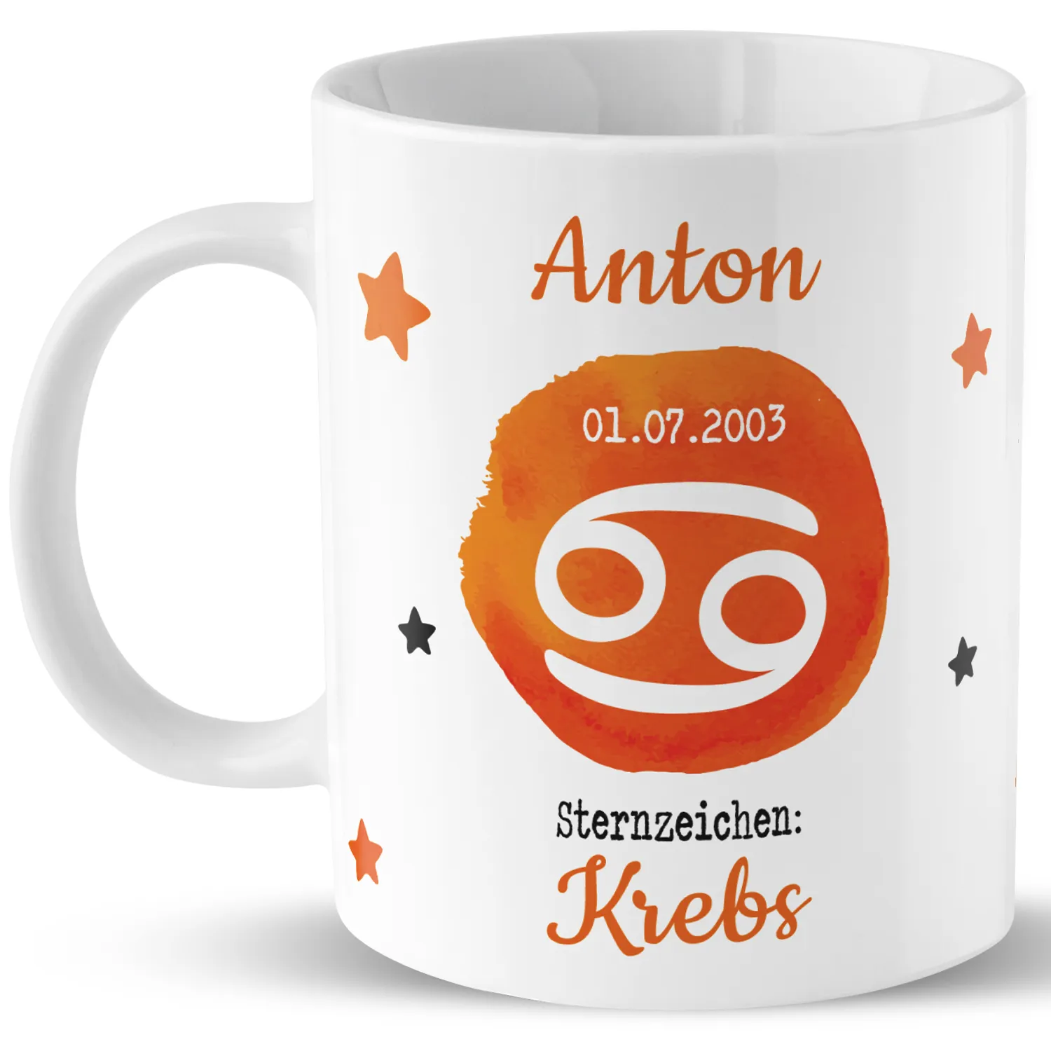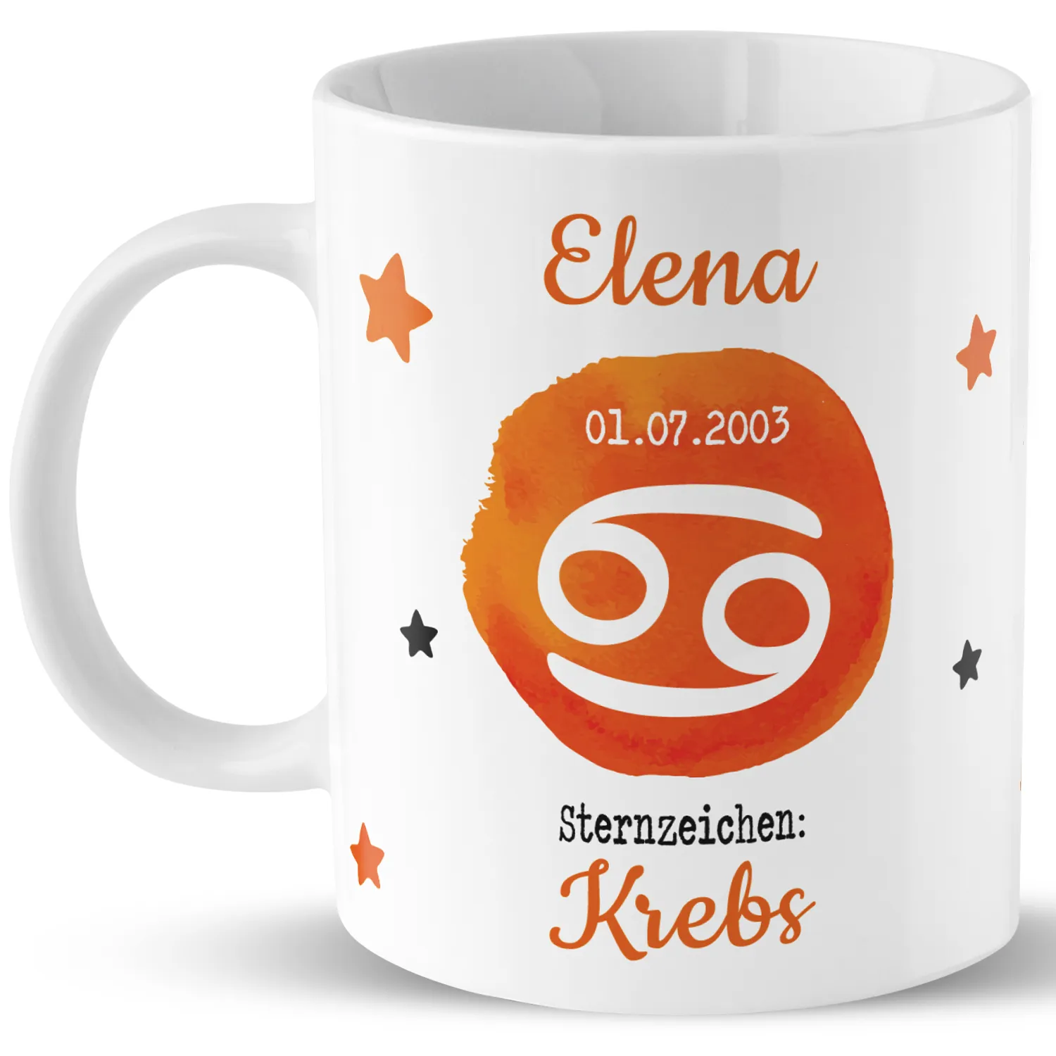 Tasse mit Sternzeichen »Krebs«, mit Namen und Geburtsdatum, weiß, personalisiert