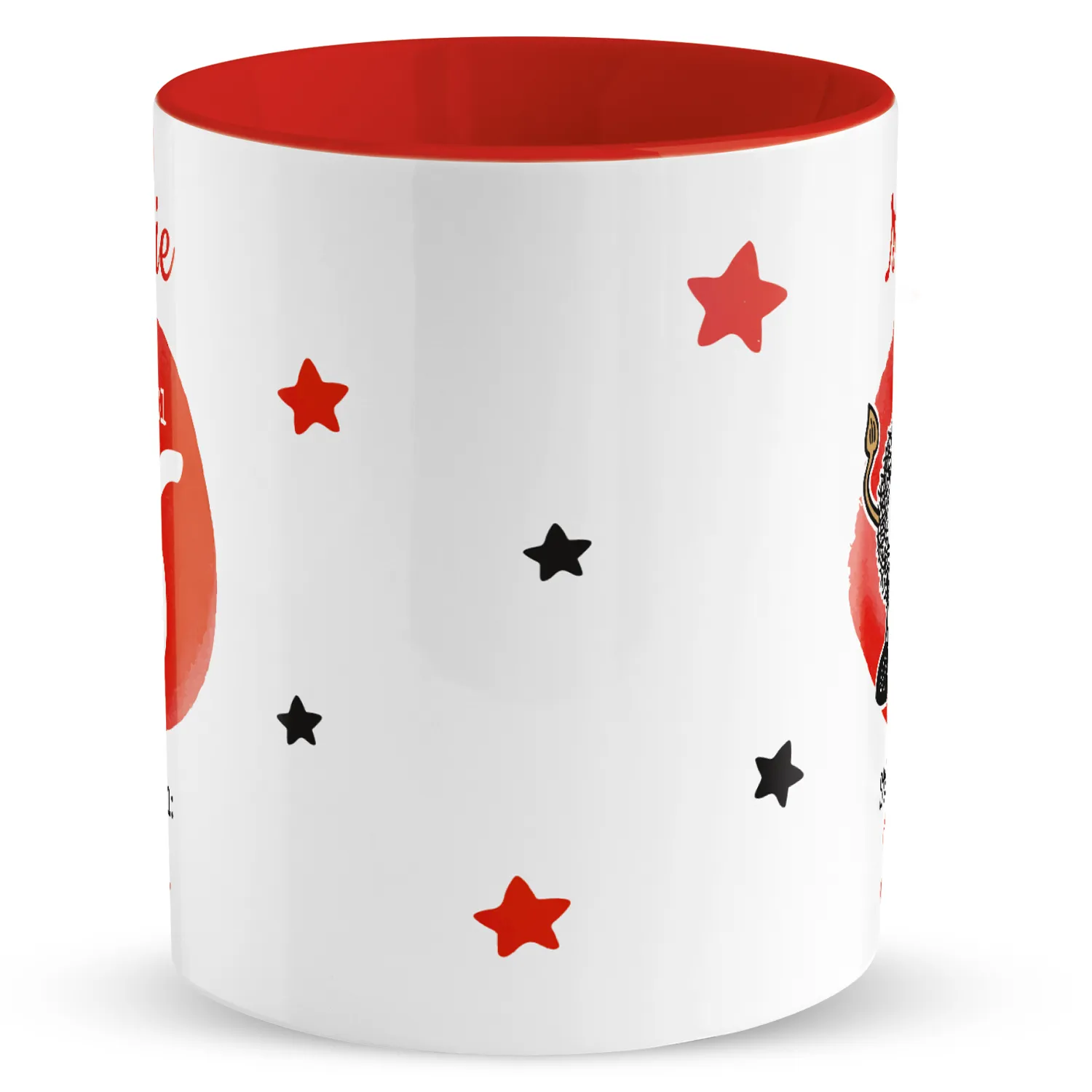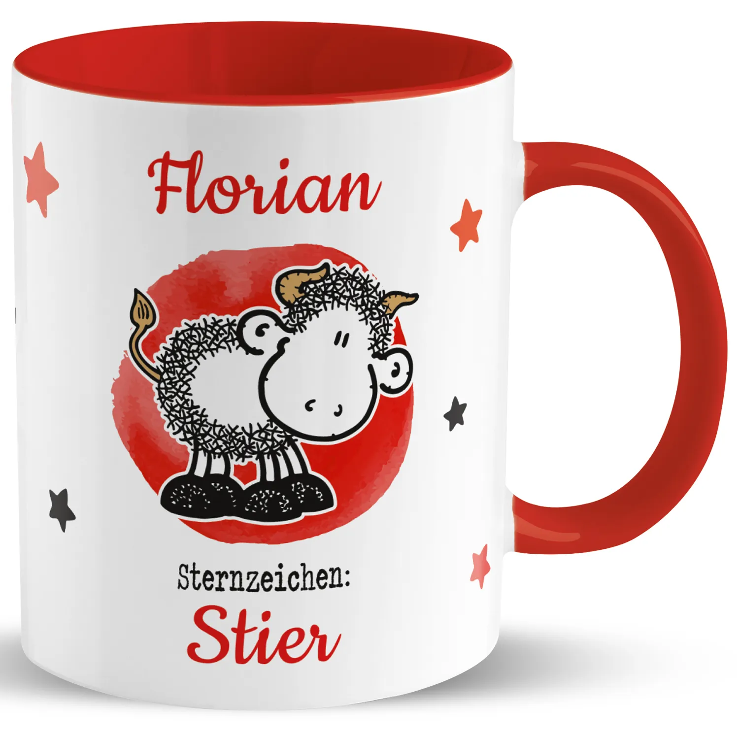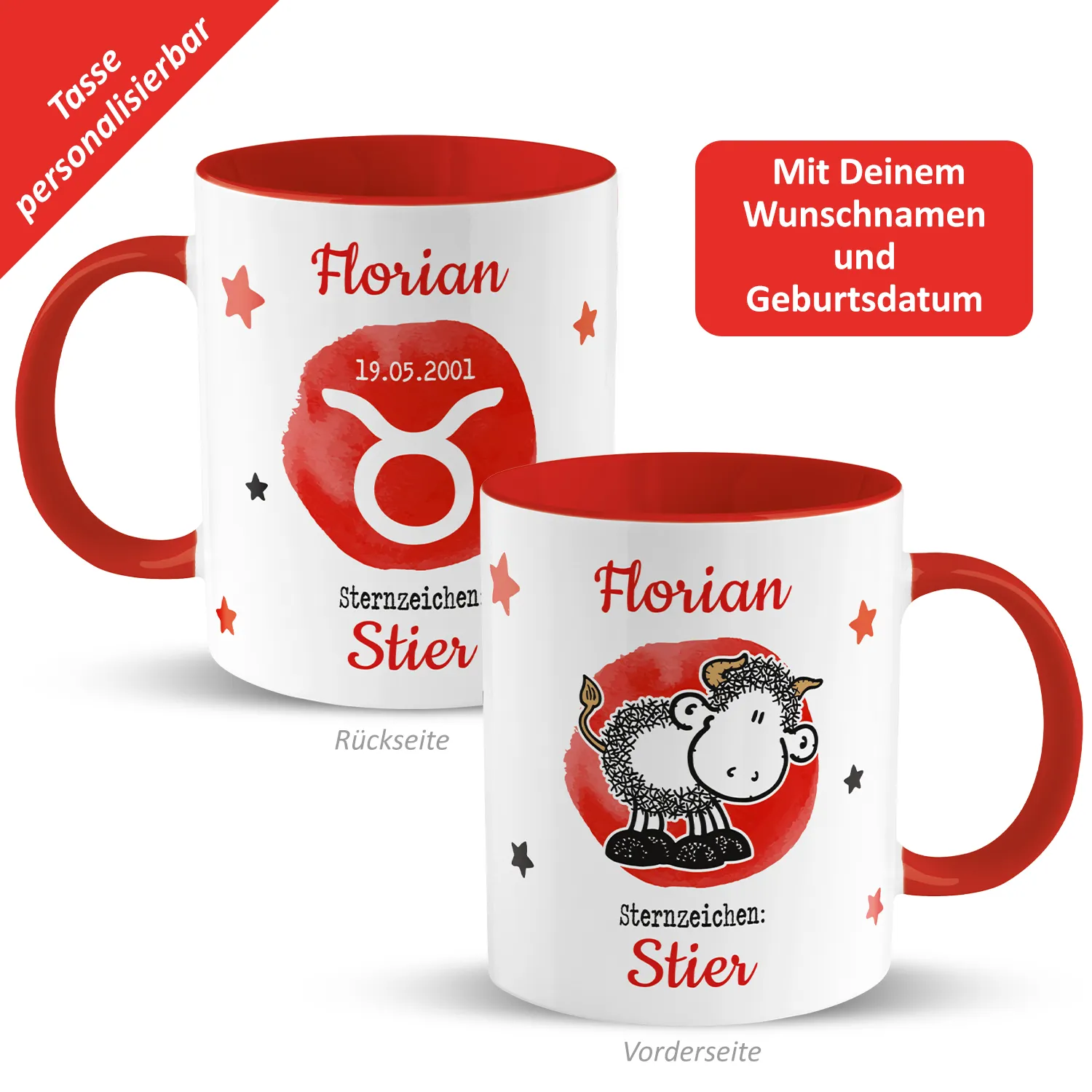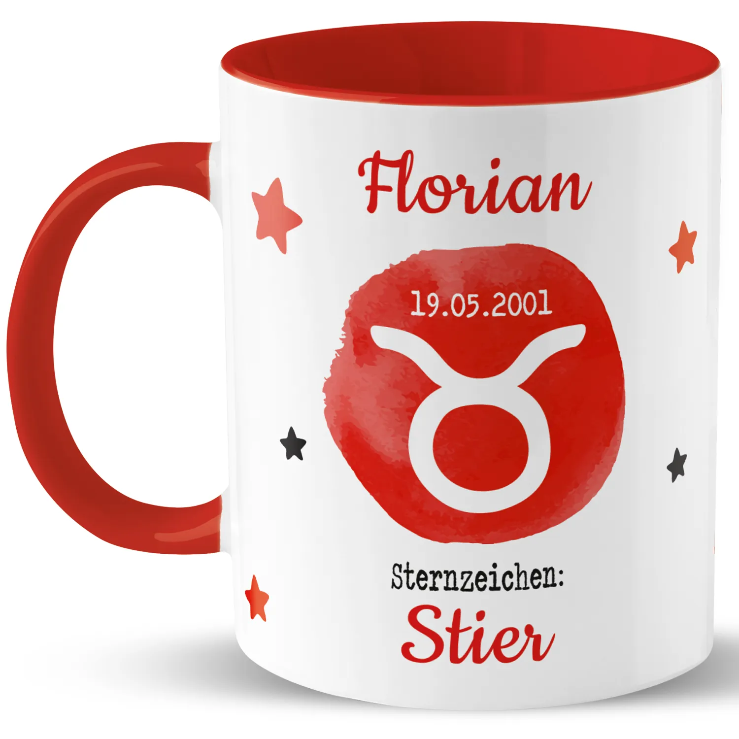 Tasse mit Sternzeichen »Stier«, mit Namen und Geburtsdatum, rot, personalisiert