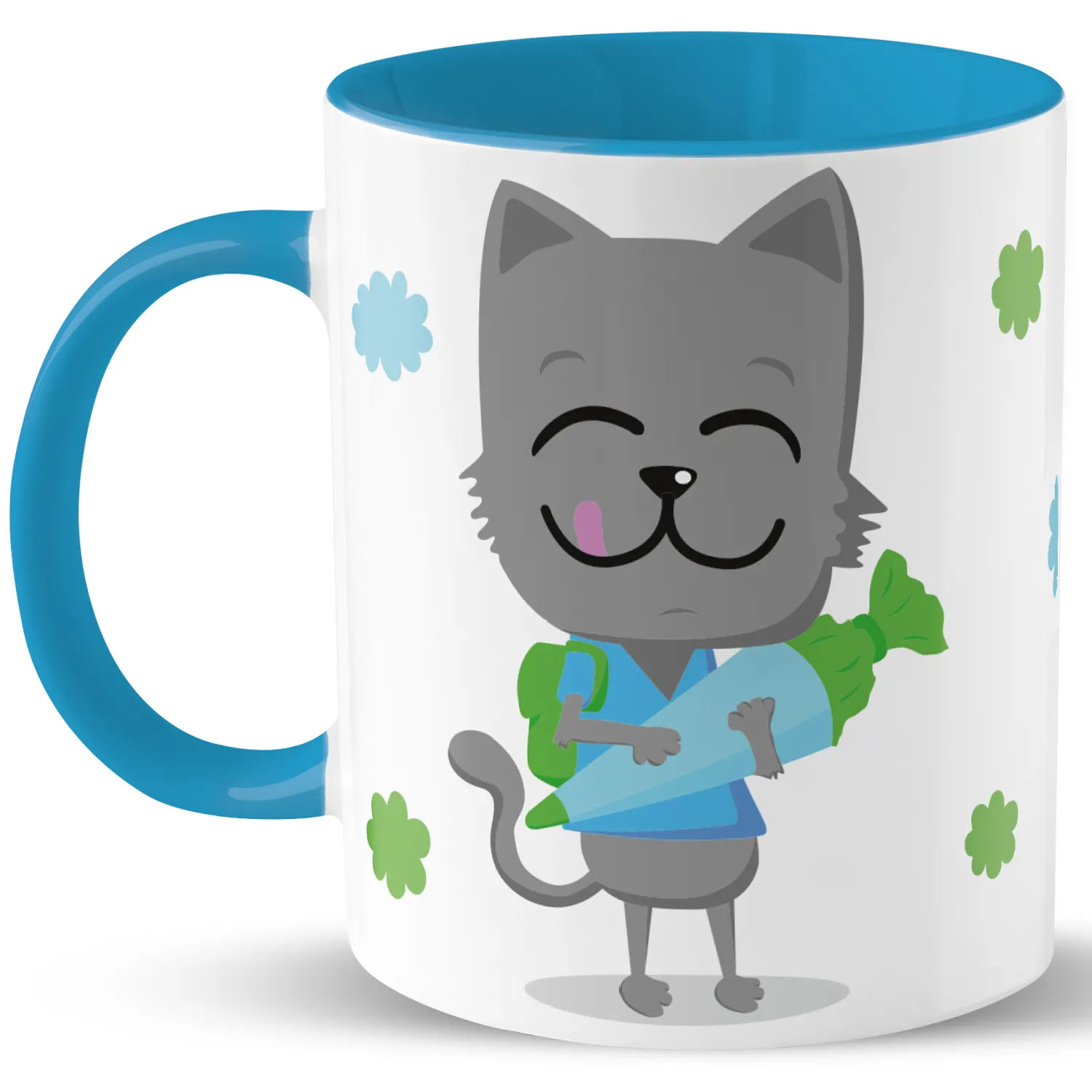Du bist auf der Suche nach einem Geschenk zur Einschulung? Die Tasse mit personalisiertem Schülernamen und witziger Katze mit Schultüte lässt sich prima mit Süßigkeiten füllen und zum ersten Schultag verschenken.