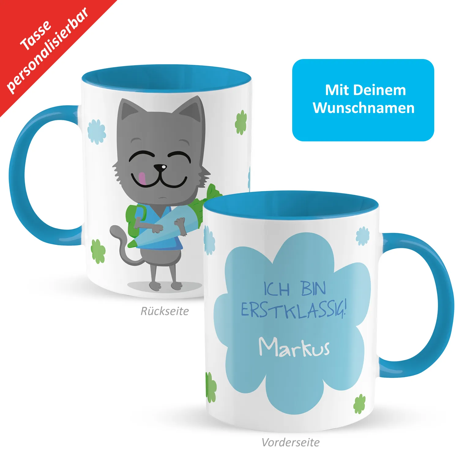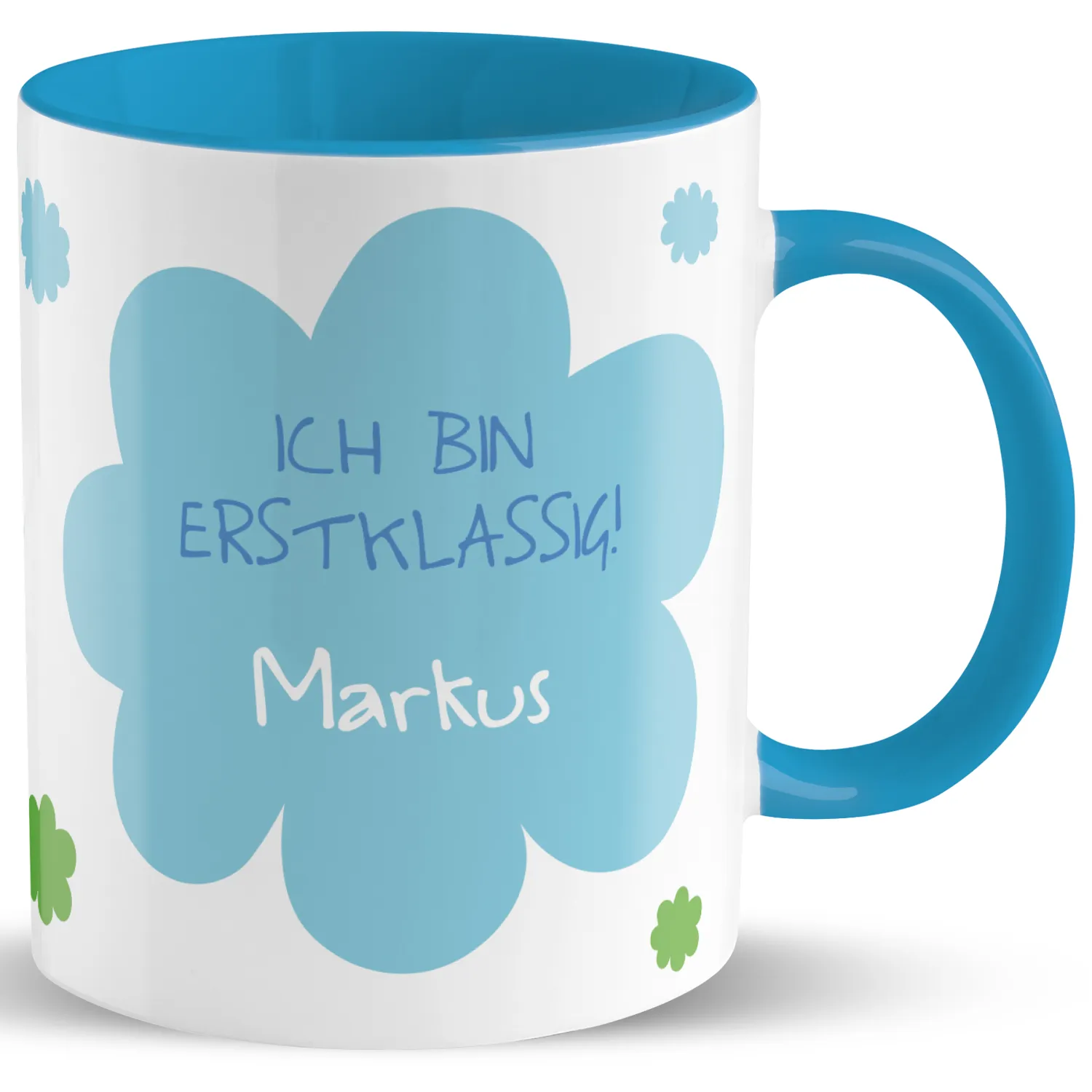 Tasse zum Schulanfang »Ich bin erstklassig! ...« mit Wunschnamen, blau, personalisiert