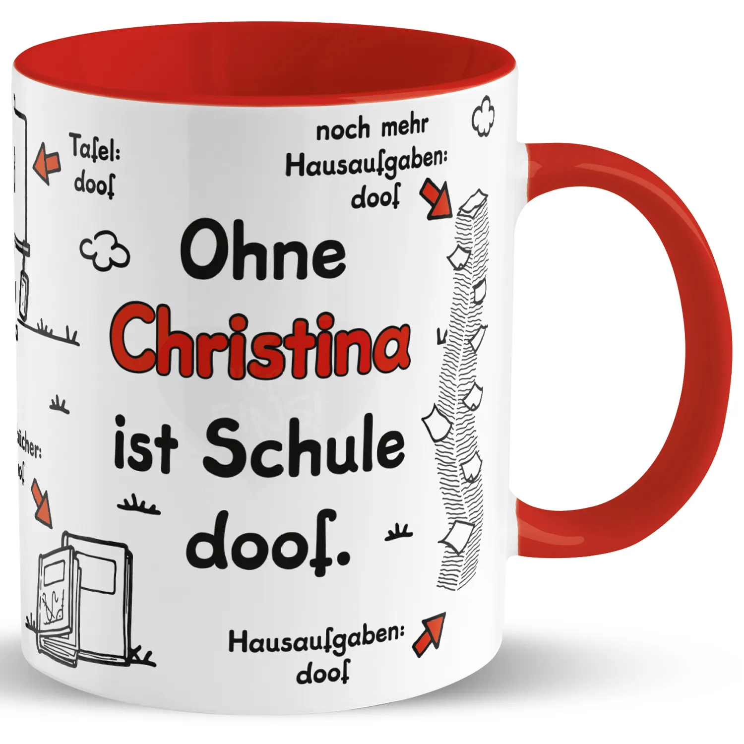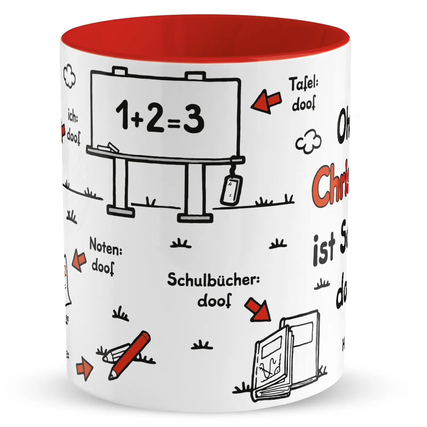 Tasse zum Schulanfang »Ohne ... ist Schule doof.« mit Wunschnamen und Klasse, rot, personalisiert