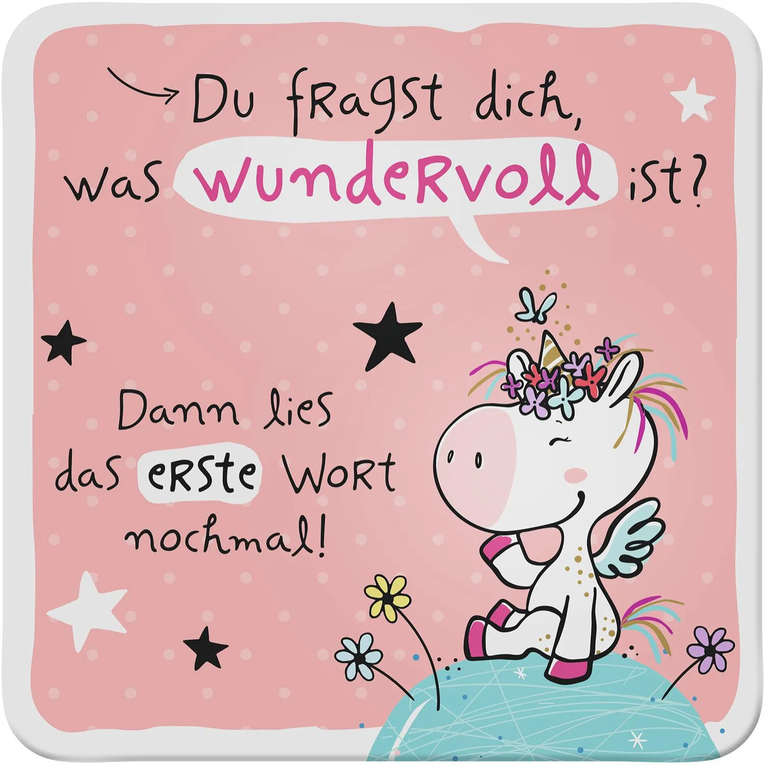 Der Untersetzer mit Motivdruck »Du fragst dich, was wundervoll ist? Dann lies das erste Wort nochmal!« hält den Tisch sauber und ist gleichzeitig ein tolles Dekoelement. Eine kreative Kombination verschiedener Untersetzer auf der gedeckten Tafel ist der Hingucker auf der nächsten Gartenparty oder beim Kaffeekränzchen.