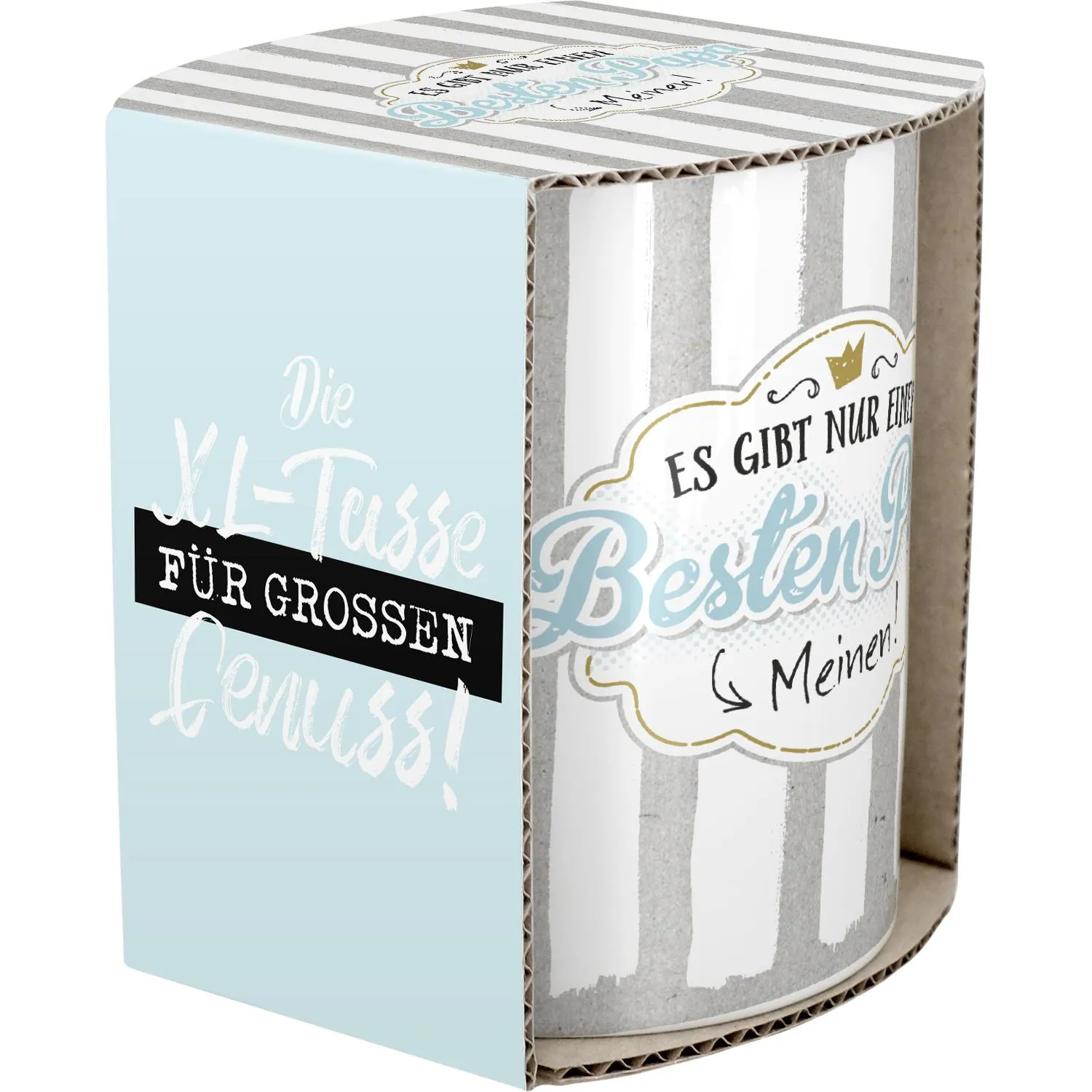 Die Botschaft »Es gibt nur einen besten Papa --> Meinen!« in Kombination mit dem trendigen Streifenmuster machen diese extragroße Tasse zum perfekten Vatertagsgeschenk. Dank der liebevoll gestalteten Geschenkbanderole ist die große Tasse bereits fertig zum Verschenken.