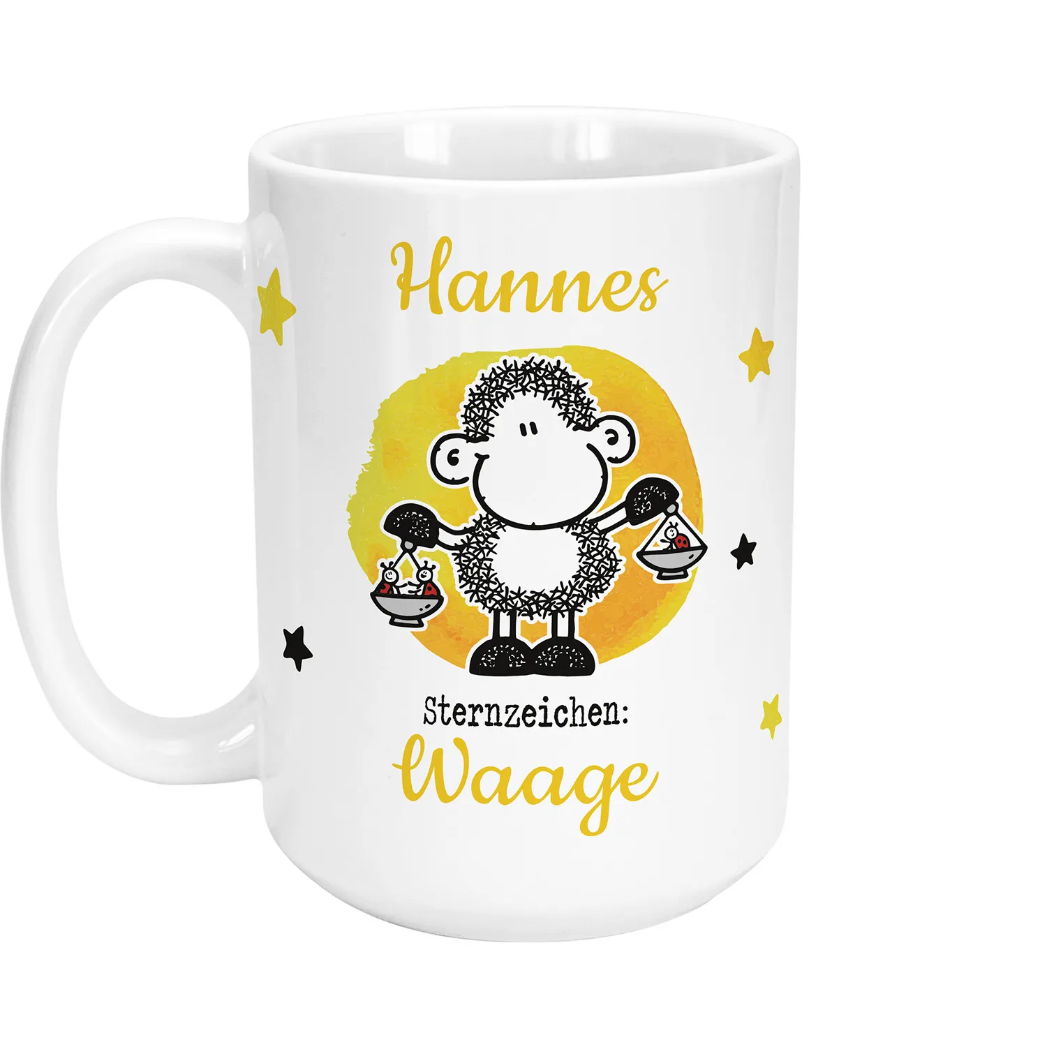 Ob Waagen besonders durstig sind, steht in den Sternen. Mit der großen XL-Tasse mit persönlichem Namen und süßem Schaf-Sternzeichen-Motiv wird ab sofort jeder noch so große Durst gelöscht. Die Riesentasse ist eine optimale Geschenkidee für eine »Waage«, die Kaffee oder Tee in rauen Mengen genießt.Hinweis: Sternzeichen »Waage« (Zeitraum: 24.09. - 23.10.)