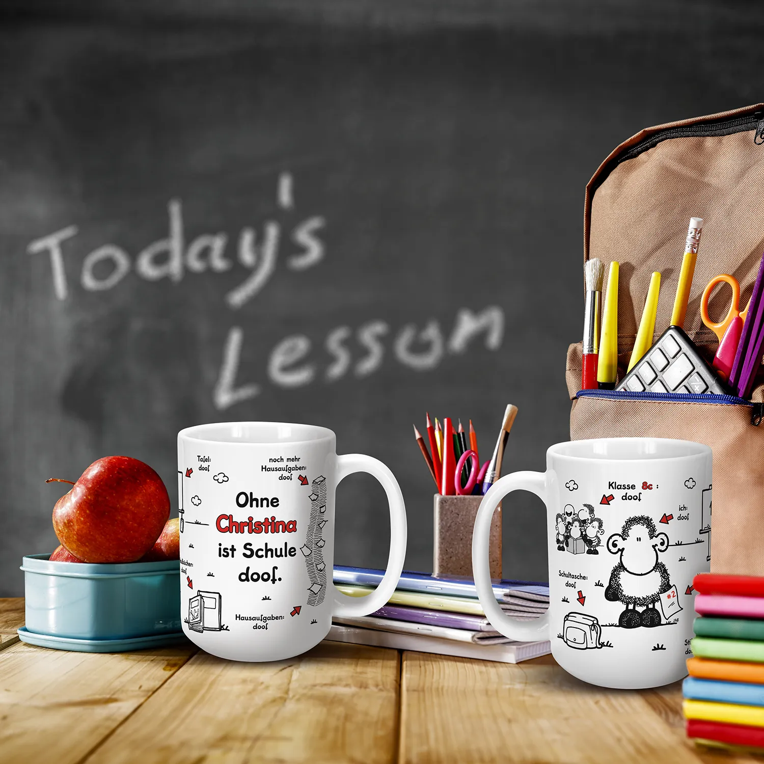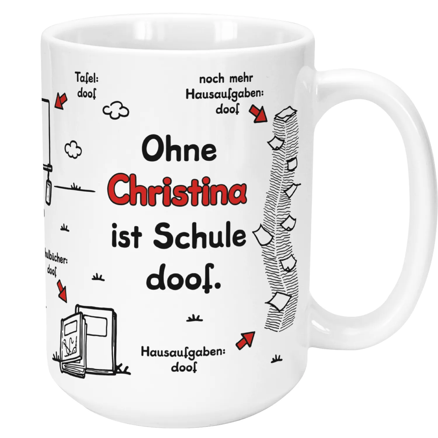 XL-Tasse zum Schulanfang »Ohne ... ist Schule doof.« mit Wunschnamen und Klasse, weiß, personalisiert