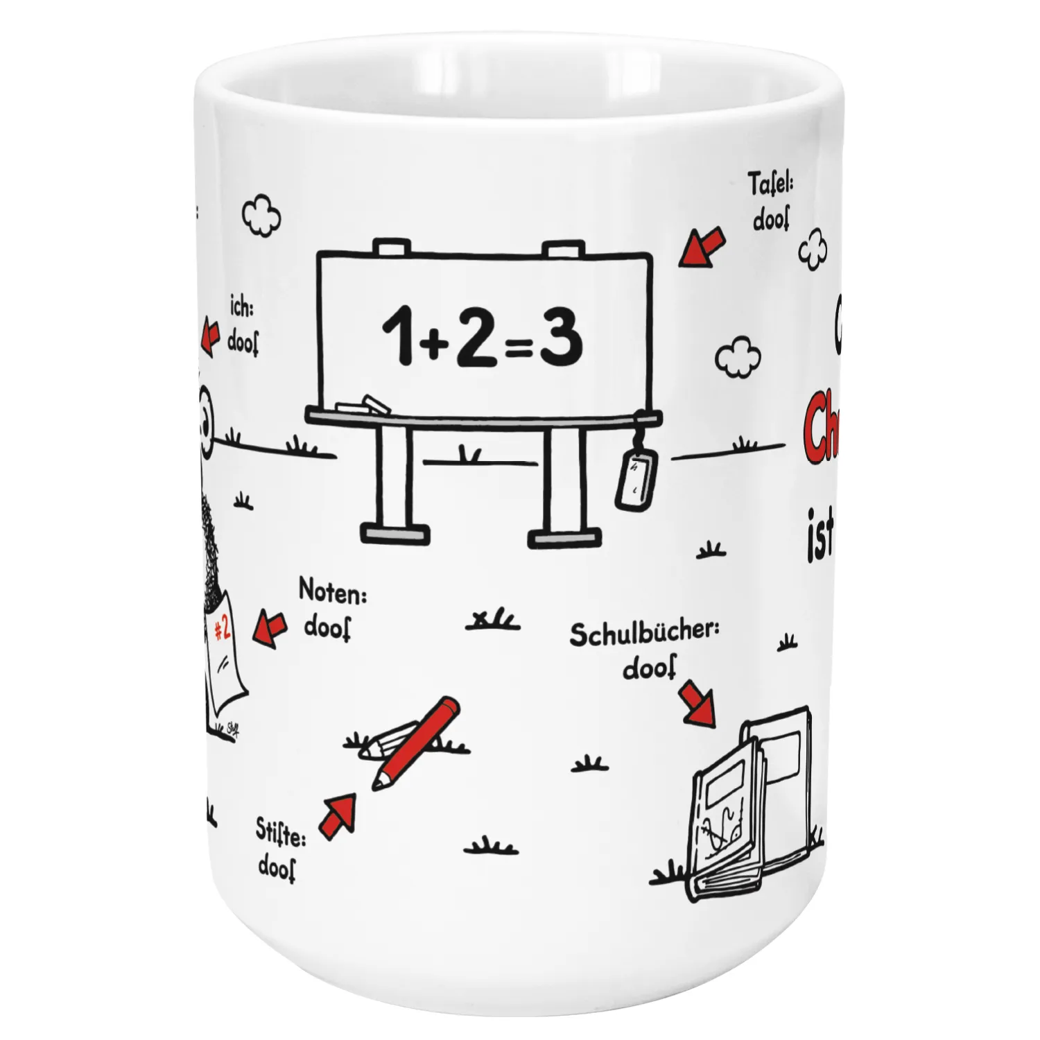 Produktinformationen "XL-Tasse zum Schulanfang »Ohne ... ist Schule doof.« mit Wunschnamen und Klasse, weiß, personalisiert"