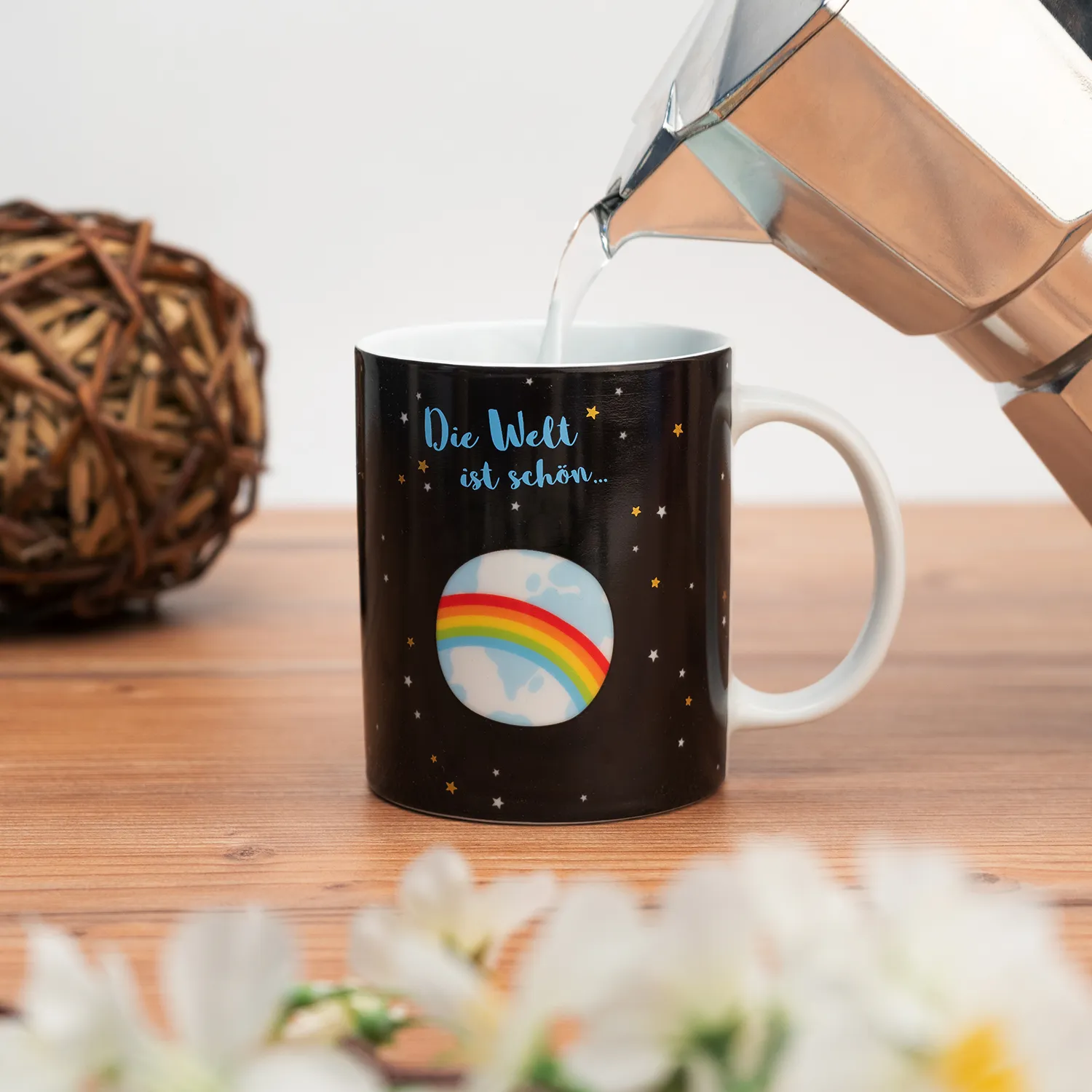 Zaubertasse Motiv »Die Welt ist schön... weil Du mit drauf bist«